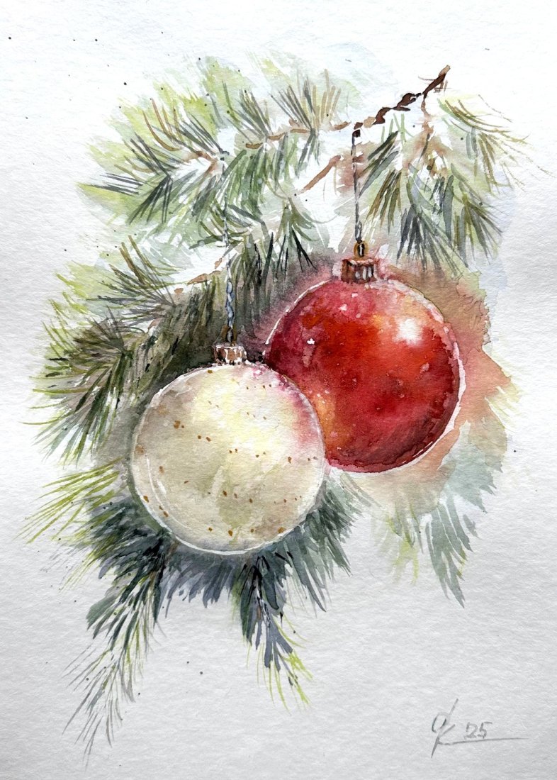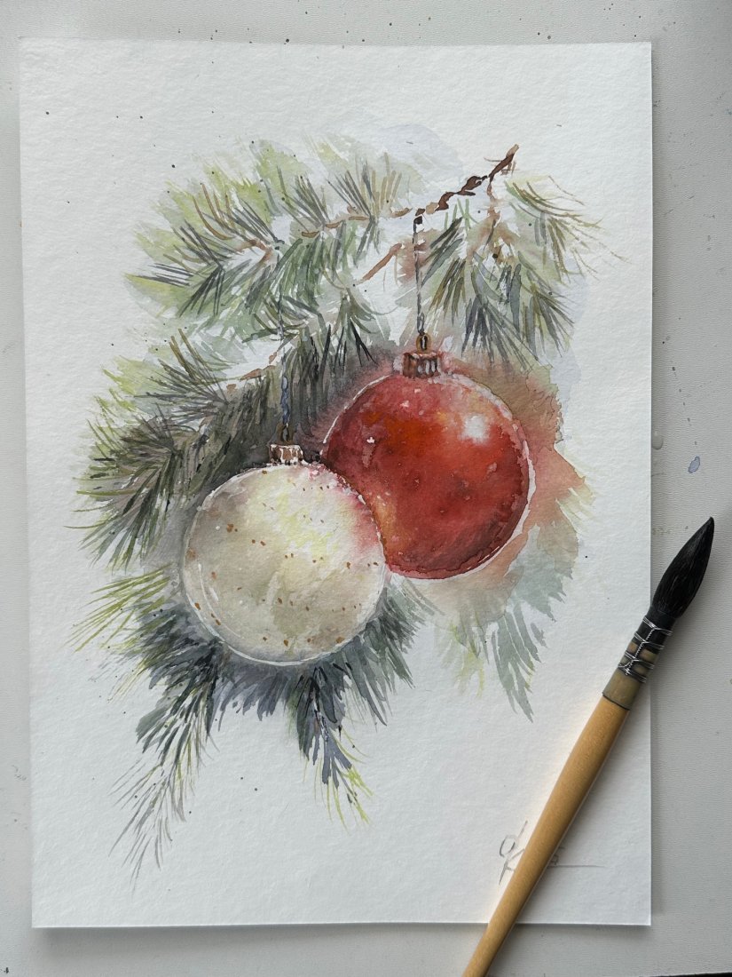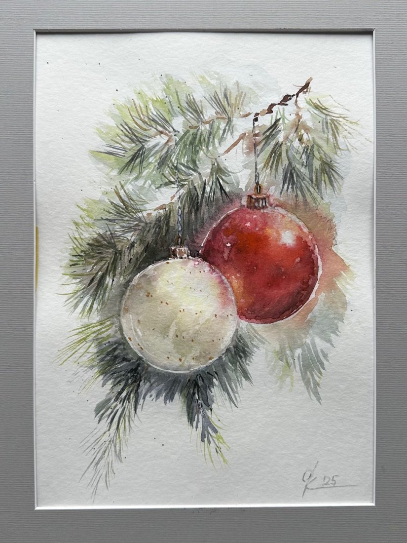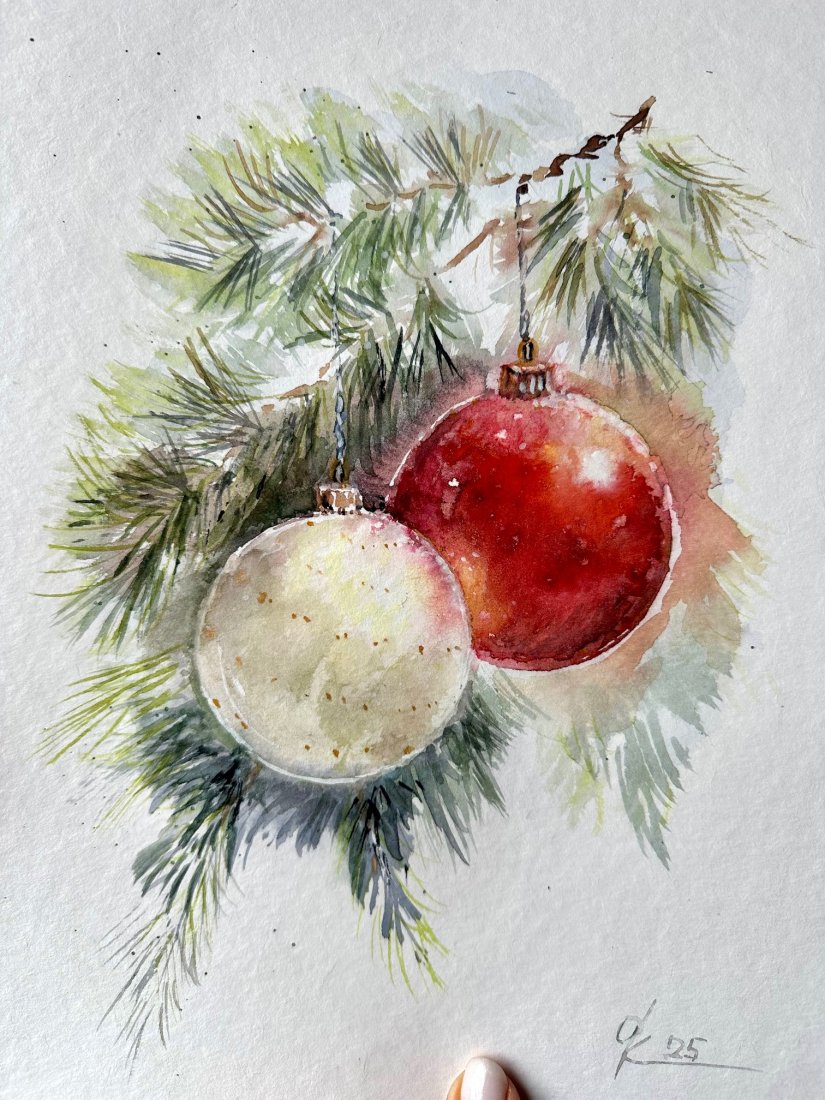 Zabawki noworoczne originalna akwareli A4 ręcznie malowana.