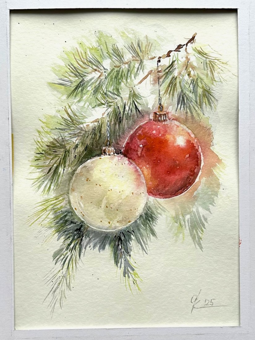 Zabawki noworoczne originalna akwareli A4 ręcznie malowana.