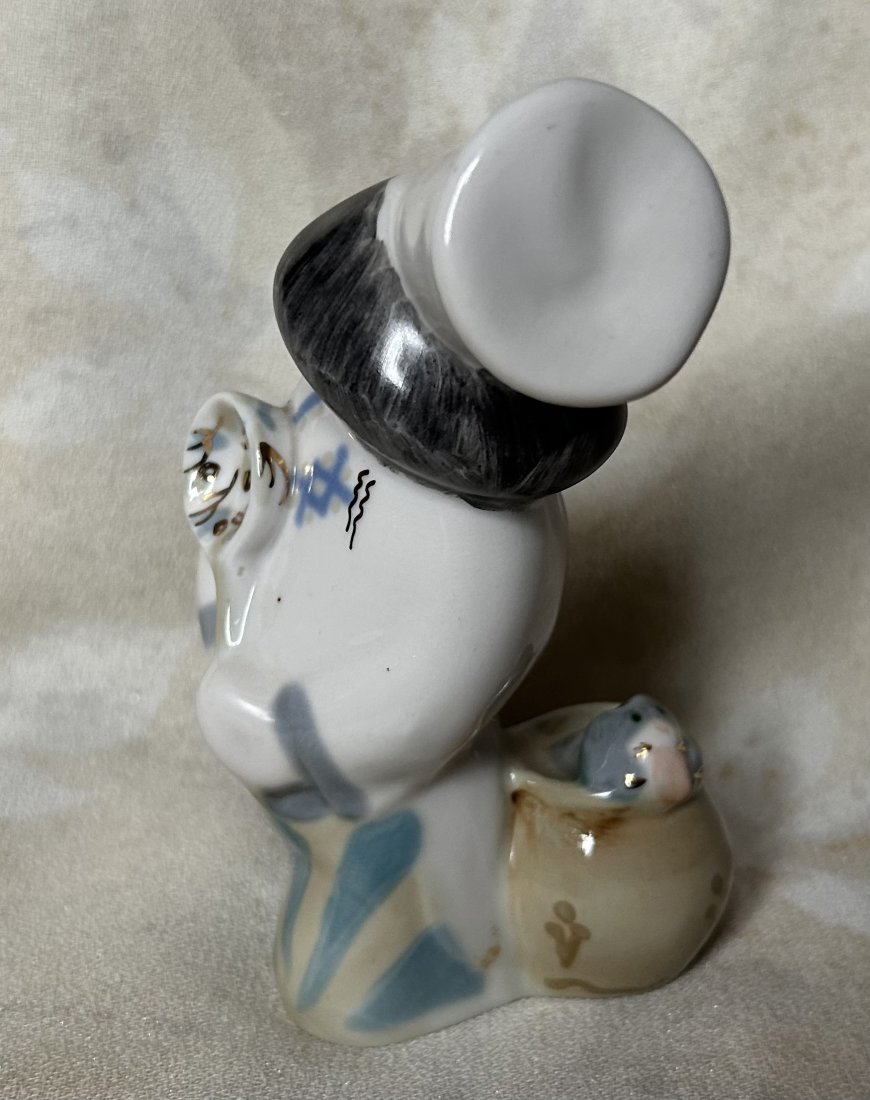 Zabawna , ciekawa i niespotykana figurka porcelanowa . Sygnowana . Pusta w środku z dziurką od spodu . Ręcznie malowana . Złotem okraszona. Podstawa około 6,5 c 5,5 wysokość 12,5 Stan zachowania bardzo dobry . Ciekawa rzecz do kolekcji i na oryginalny prezent .