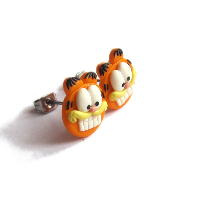 Zabawne kolorowe malutkie kolczyki wykonane ręcznie z masy termoutwardzalnej Fimo w kształcie kotów Garfield. Wielkość kolczyków to ok. 12 mm. Sztyfty wykonane są ze stali chirurgicznej. Kolczyki świetne na prezent. Zobacz moją całą galerię w Decobazaar!