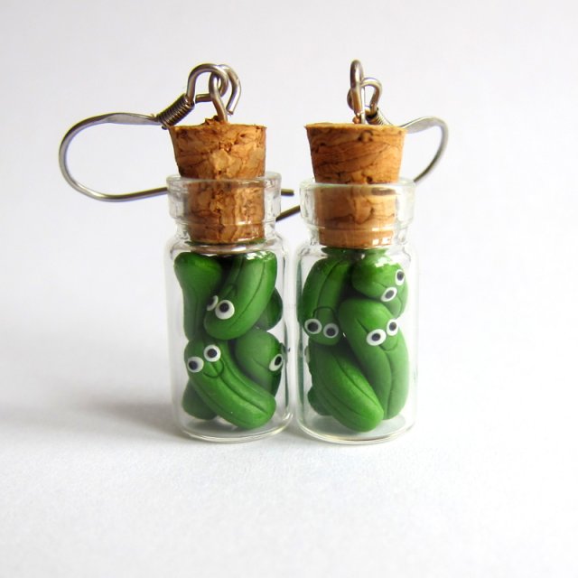 Zabawne kzielone kolczyki ogórki wykonane ręcznie z masy termoutwardzalnej Fimo i ze szklanych słoiczków. Wielkość słoiczków to 2,2 x 1,1 cm, długość kolczyków z biglami to to ok. 4 cm. Sztyfty wykonane są ze stali chirurgicznej. Kolczyki świetne na prezent.