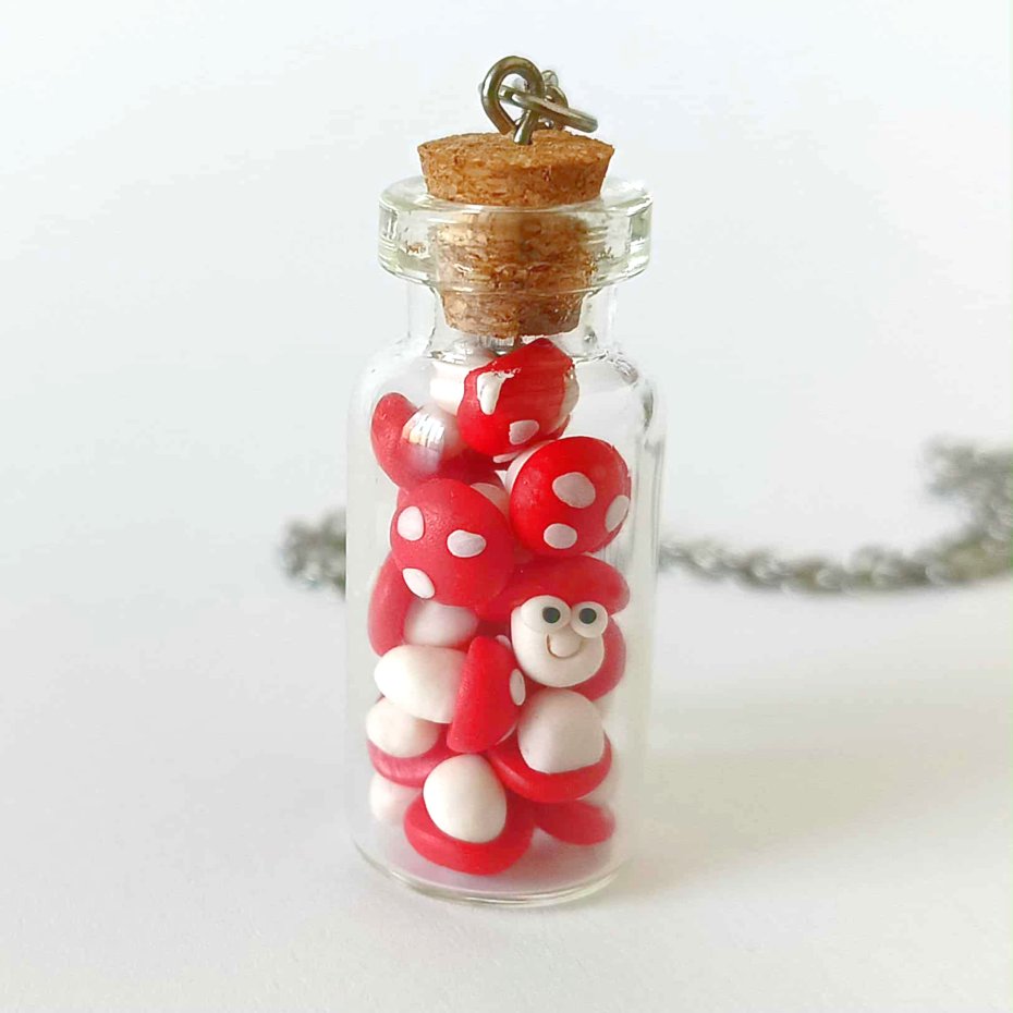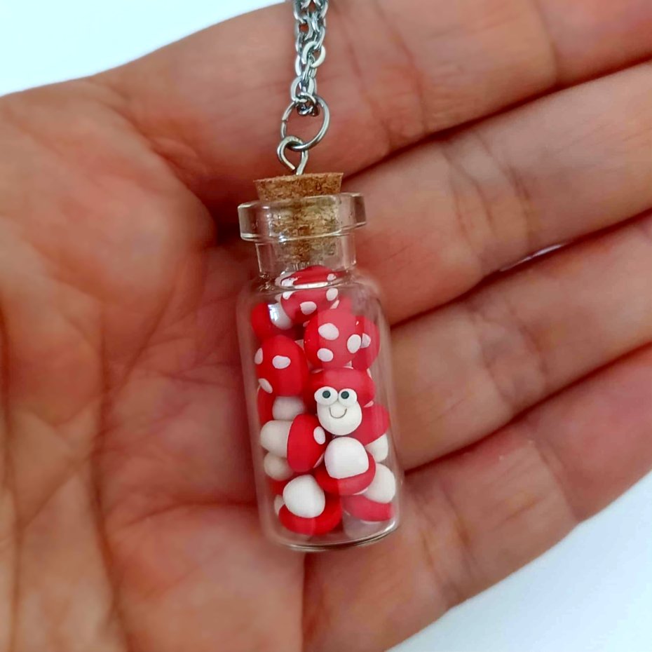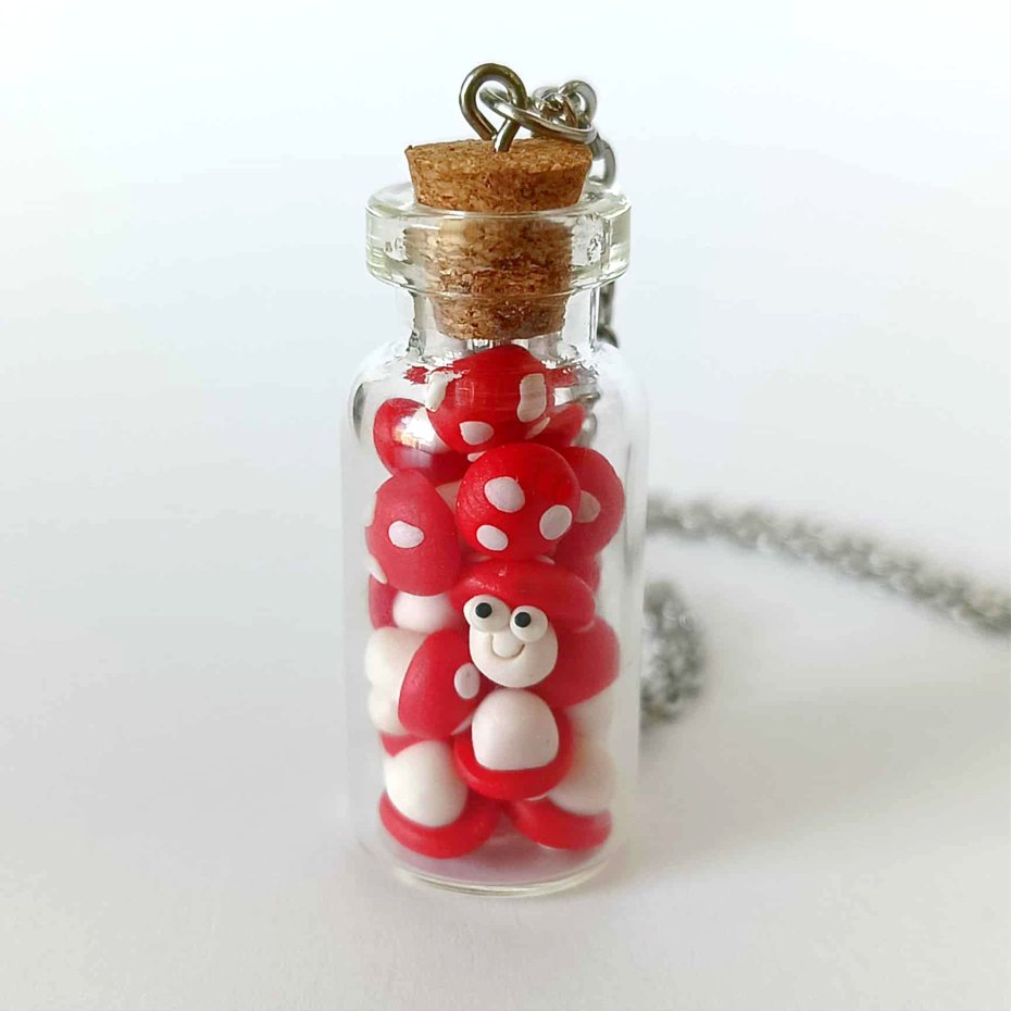 Zabawny czerwony wisiorek z muchomorami wykonany ręcznie z masy termoutwardzalnej Fimo i ze szklanego słoiczka. Wielkość słoiczka to około 4 x 1,5 cm, długość łańcuszka to 50 cm + łańcuszek regulacyjny.