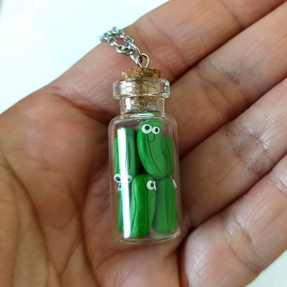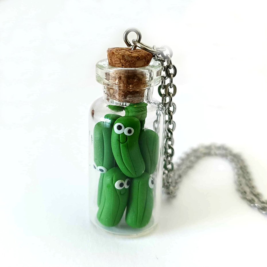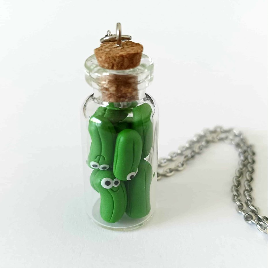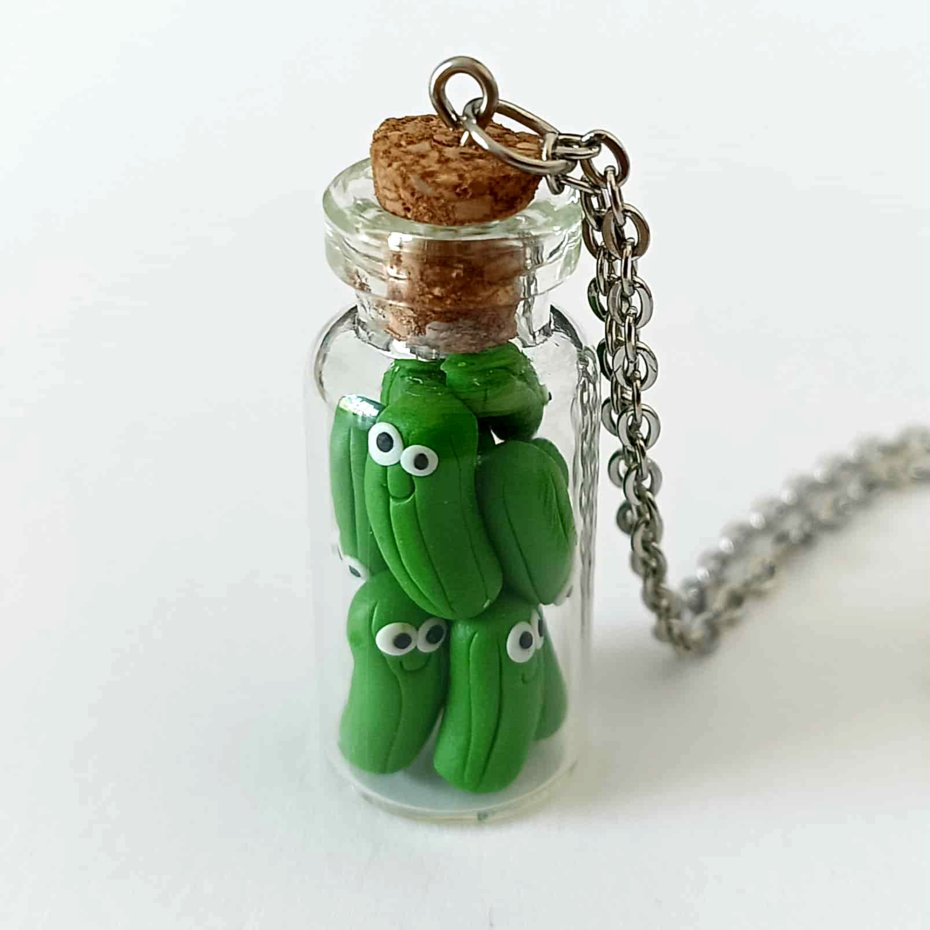 Zabawny zielony wisiorek z piklami wykonany ręcznie z masy termoutwardzalnej Fimo i ze szklanego słoiczka. Wielkość słoiczka to około 4 x 1,5 cm, długość łańcuszka to 50 cm + łańcuszek regulacyjny.