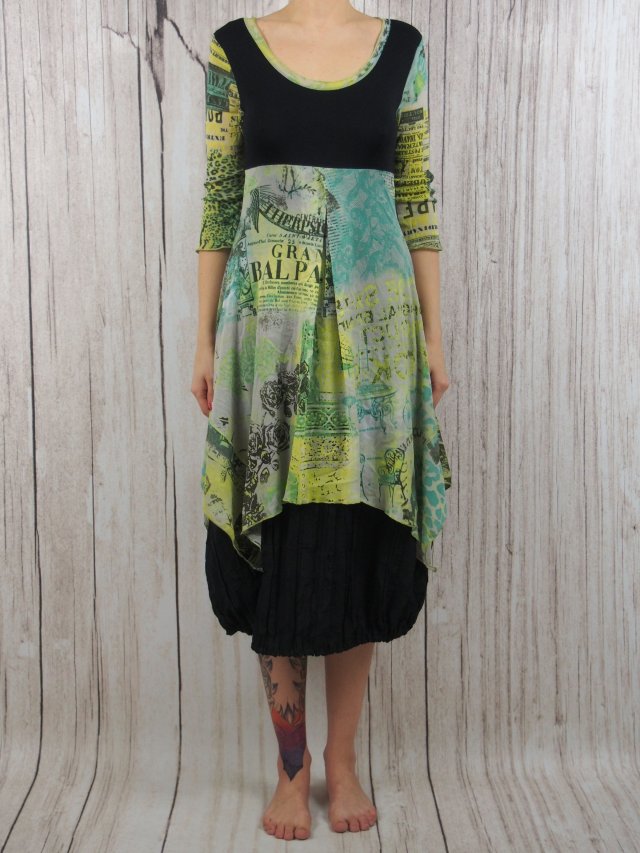 Artystyczna sukienka francuskiej marki ME. Z wiskozy z dodatkiem elastyny. Nadruk to różne napisy, rowery, zabytkowe stoły, kwiaty, fragmenty map.