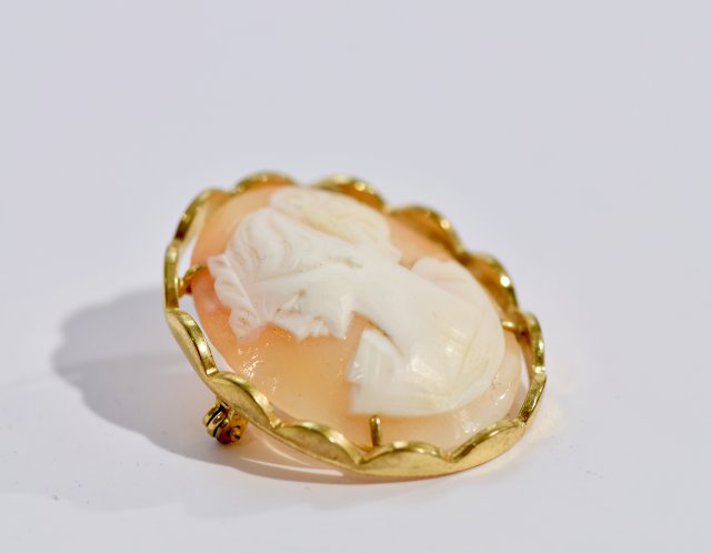 Zabytkowa broszka angielska powojenna z ręcznie rzeźbioną kameą gemmą (w muszli).