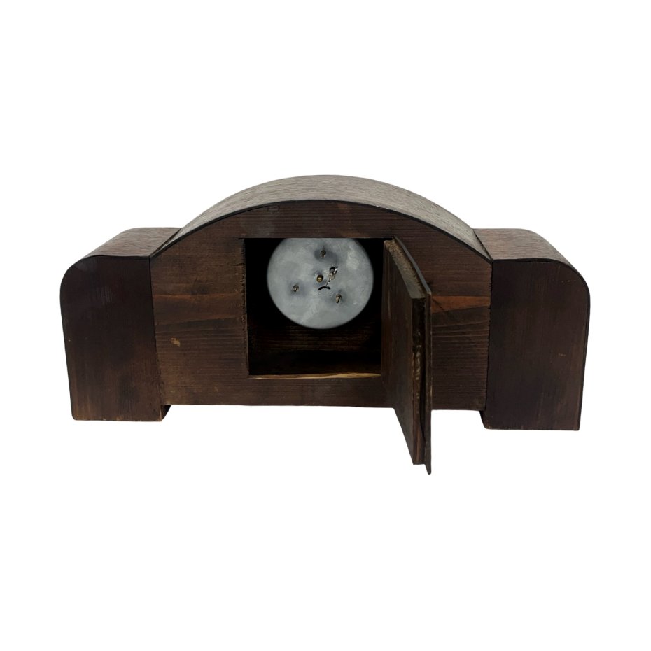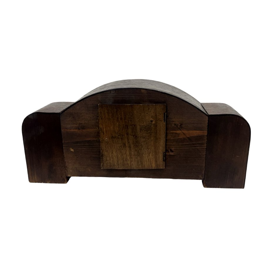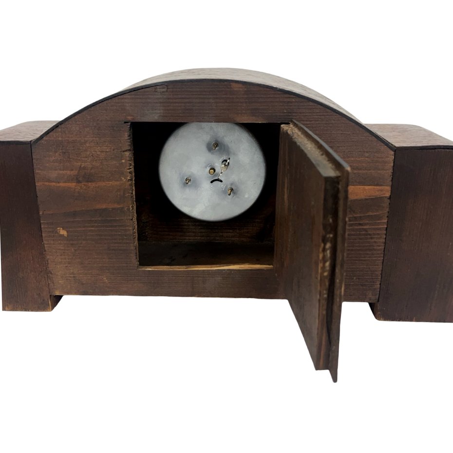 Unikatowy zegar kominkowy (gabinetowy) utrzymany w charakterystycznej dla epoki stylistyce Art Deco. Przedmiot łączy w sobie geometryczną formę z szlachetnymi materiałami, stanowiąc doskonały przykład europejskiego rzemiosła z połowy XX wieku.