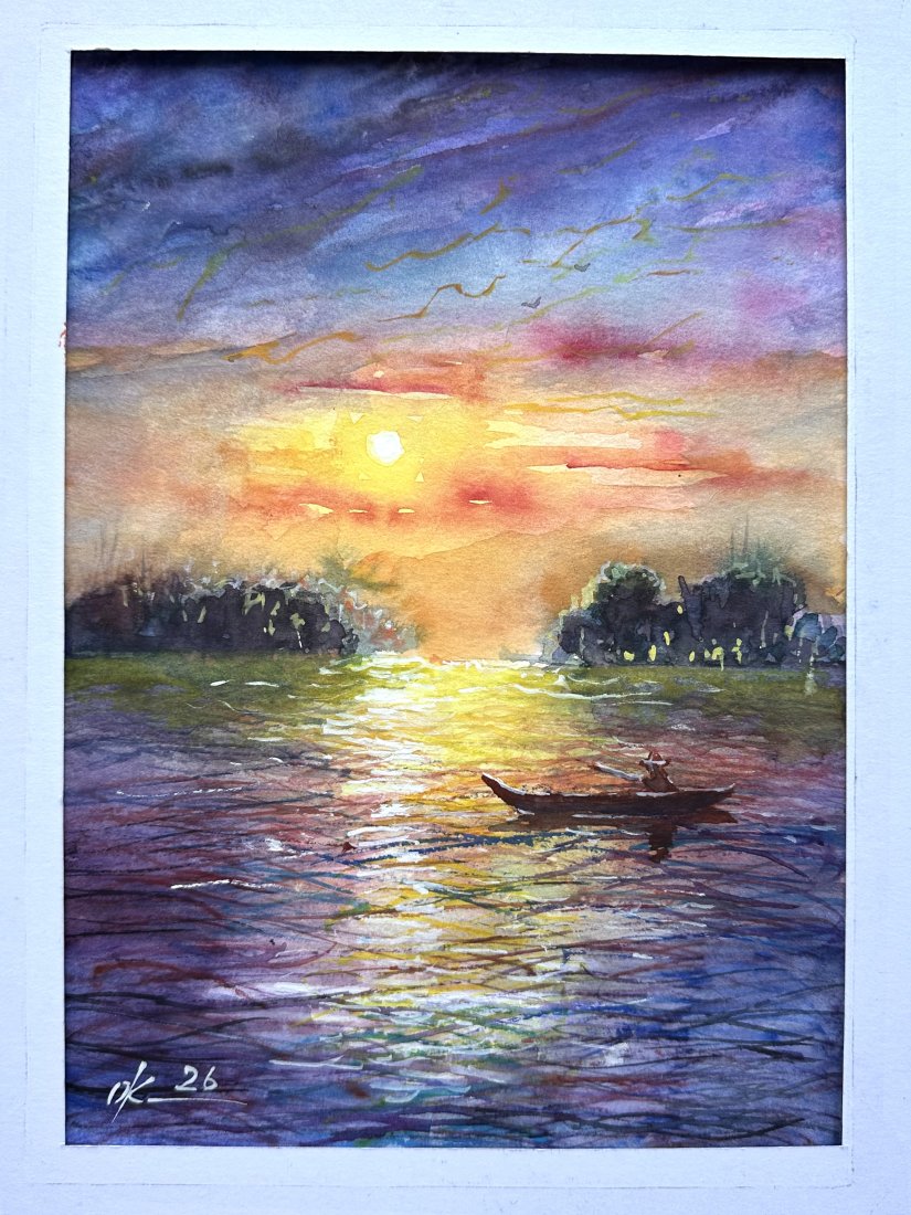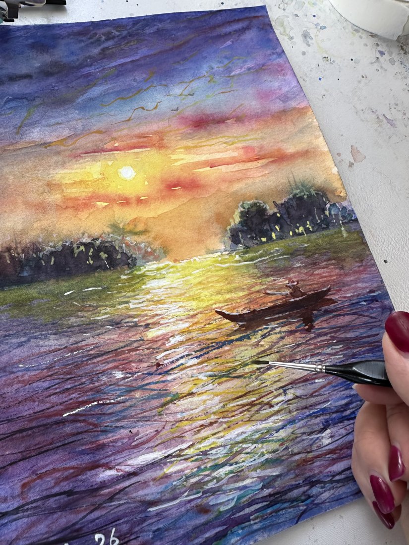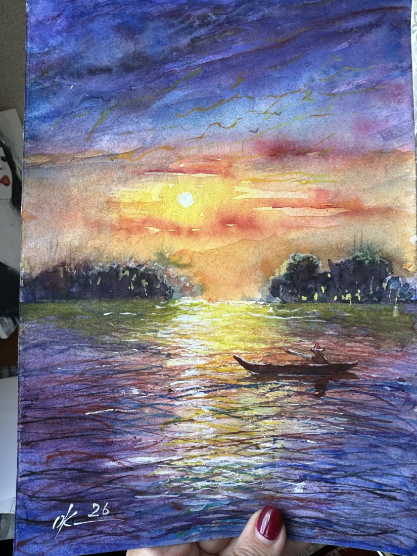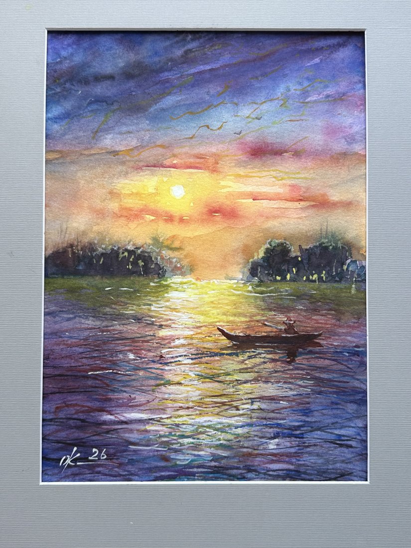 Zachód słońca w lagunie. Original Akwarela A4 ręcznie malowana.