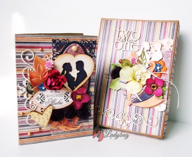 Wyjątkowa, pełna detali i drobiazgów, bogato zdobiona kartka ślubna w ozdobnym pudełku. Bajeczne kolory zachodzącego słońca, ciepło wykończone brązowym tuszem. Bukiet kolorowych kwiatów roziskrzony został kryształowymi ćwiekami, a osadzony na tekturowych elementach.