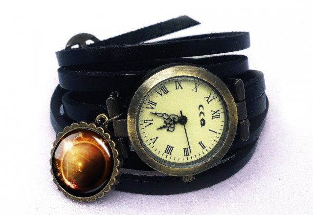 Zegarek ze skórzanym paskiem kilkakrotnie zakręcanym na ręku z ręcznie robioną zawieszką (kaboszonem).