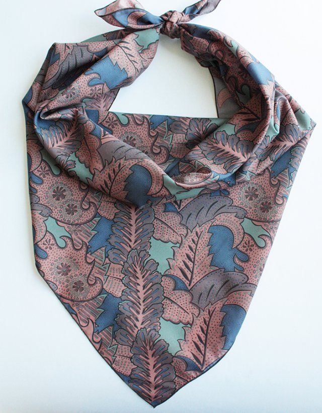 Duża chusta we wzory w stonowanych kolorach. Wykonana prawdopodobnie z poliestru.