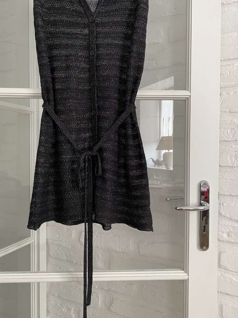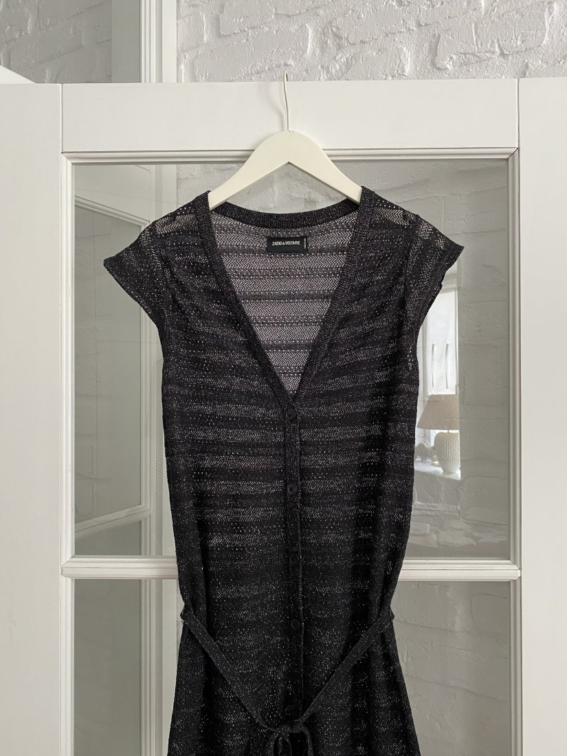 Czarna sukienka dzianinowa z metalicznym splotem. Dekolt w serek. Krótkie rękawy. Zapięcie na guziki z przodu. Odpinany pasek w talii. Konstrukcja dzianiny z metalicznym splotem.