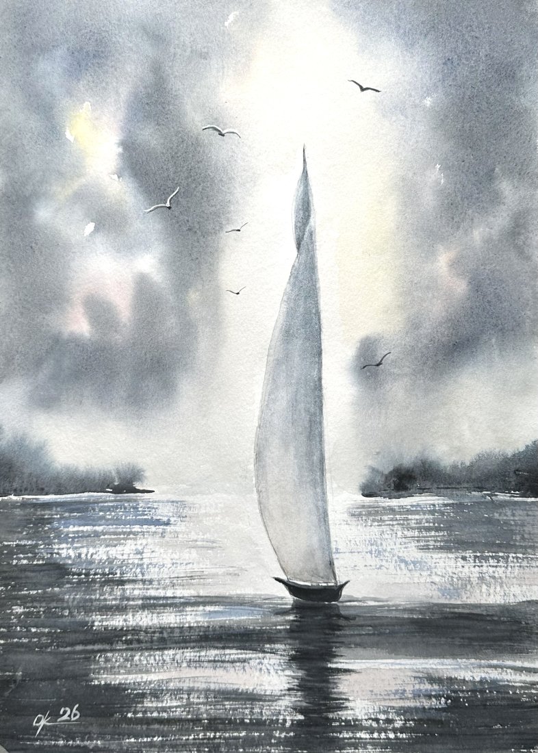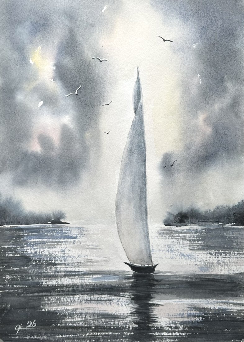 Żaglówka na morzu. Akwarela A4 ręcznie malowana.