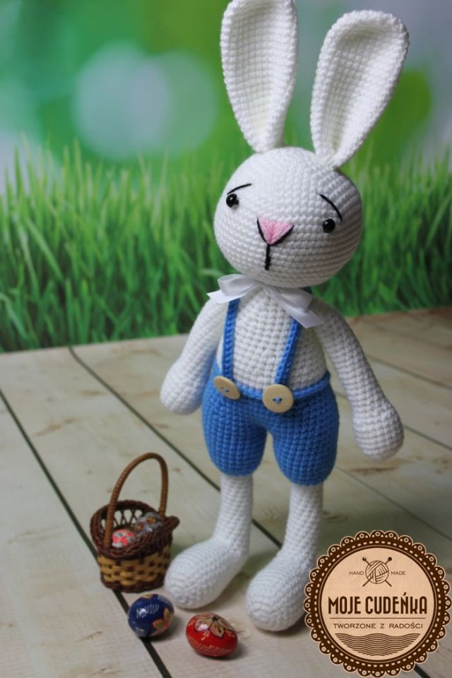 Pluszaczek wykonany z włóczki szydełkiem. Zajączek w spodenkach na szelkach. Wypełniony mięciutkim wkładem silikonowym. Wysokość z uszkami prawie 50 cm.
