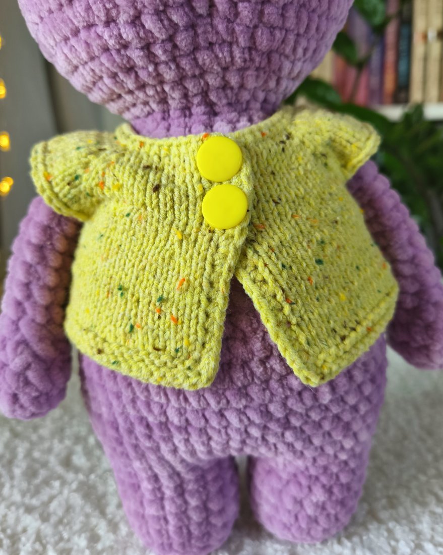 • Zabawka ma sobie zdejmowaną bluzę w kolorze jasnej soczystej cytryny z kolorowymi kropeczkami, zapinaną na napy plastikowe. Bluza wykonana jest z włóczki bawełnianej.