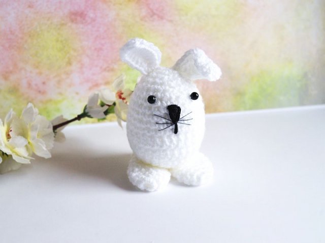 Uroczy, wielkanocny zajączek wykonany z mięciutkiej włóczki na szydełku.