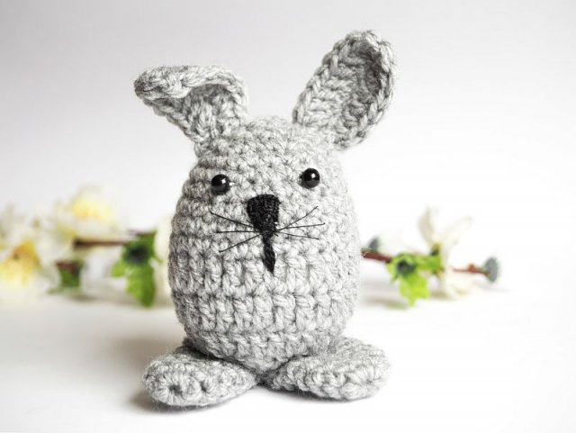 Uroczy, wielkanocny zajączek wykonany z mięciutkiej włóczki na szydełku.