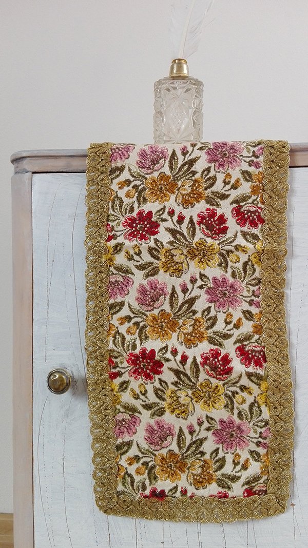 Serwetka vintage-uszyta z tkaniny żakardowej, obszyta dekoracyjną taśmą, podszyta zielonym welurem.