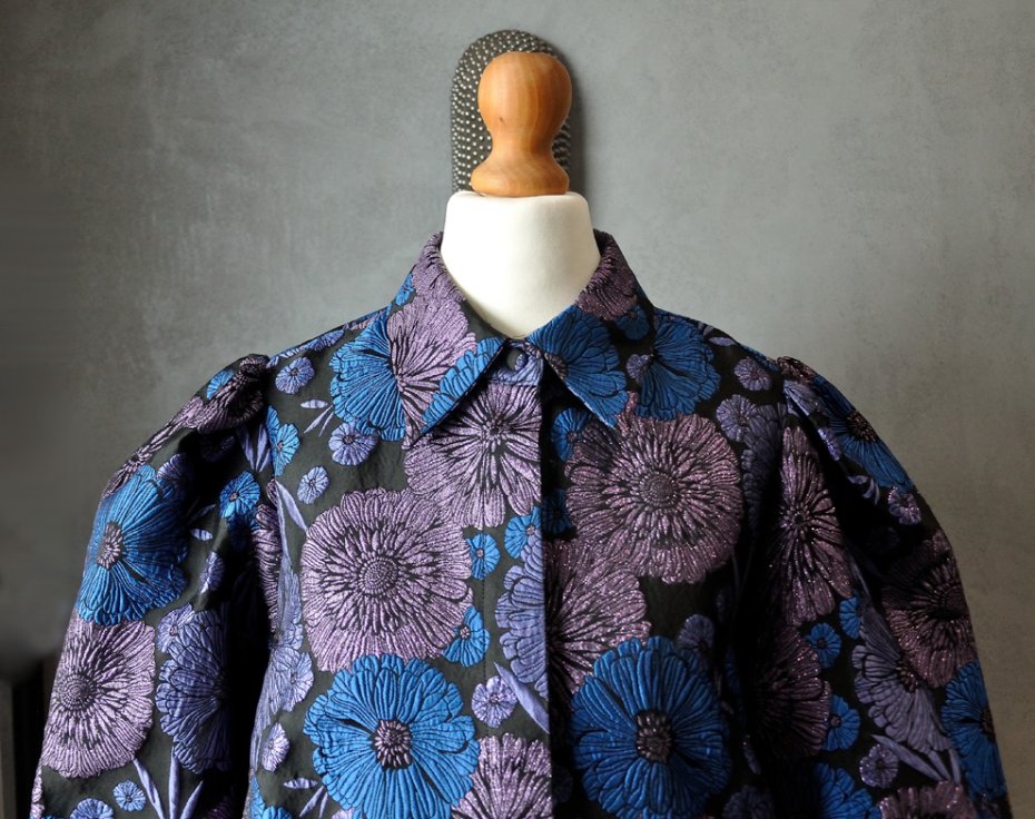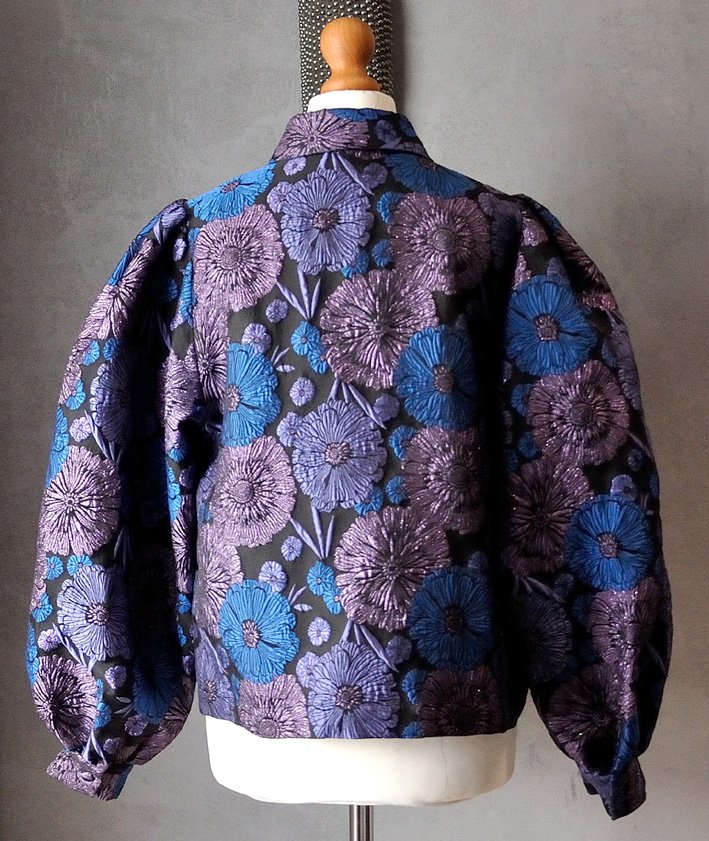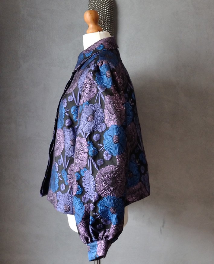 Uszyta ze sztywnej, żakardowej materii w odcieniach czerni, fioletu, różu i niebieskiego. Materiał w przepiękne, wypukłe kwiaty, zdobiony dodatkowo połyskującą nicią (niektóre kwiaty są brokatowe, niektóre - nie). Kiedyś taką tkaninę nazywałoby się brokat.