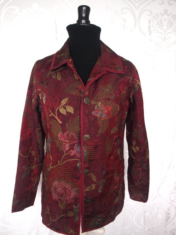 Piękna żakardowa marynarka z gobelinowej tkaniny w kolorze bordowym - duże stylowe kwiaty. Bez podszewki. Rękawy wąskie. Wykończona bordowymi lamówkami. Dekolt z małym kołnierzykiem, zapięcie na ozdobne guziki. Po bokach dwie wygodne wpuszczane kieszenie. Tkanina to mieszanka bawełny i poliestru, fajnie trzyma fason.