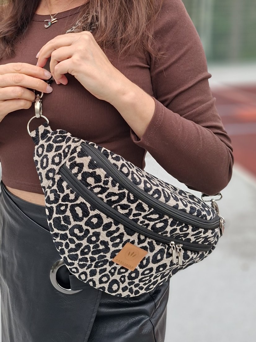 Bardzo duża nerka torebka damska z grubej, żakardowej tkaniny w panterkę.