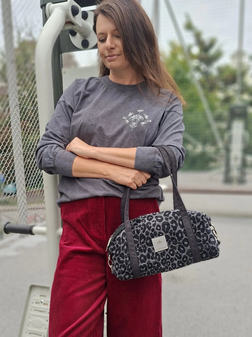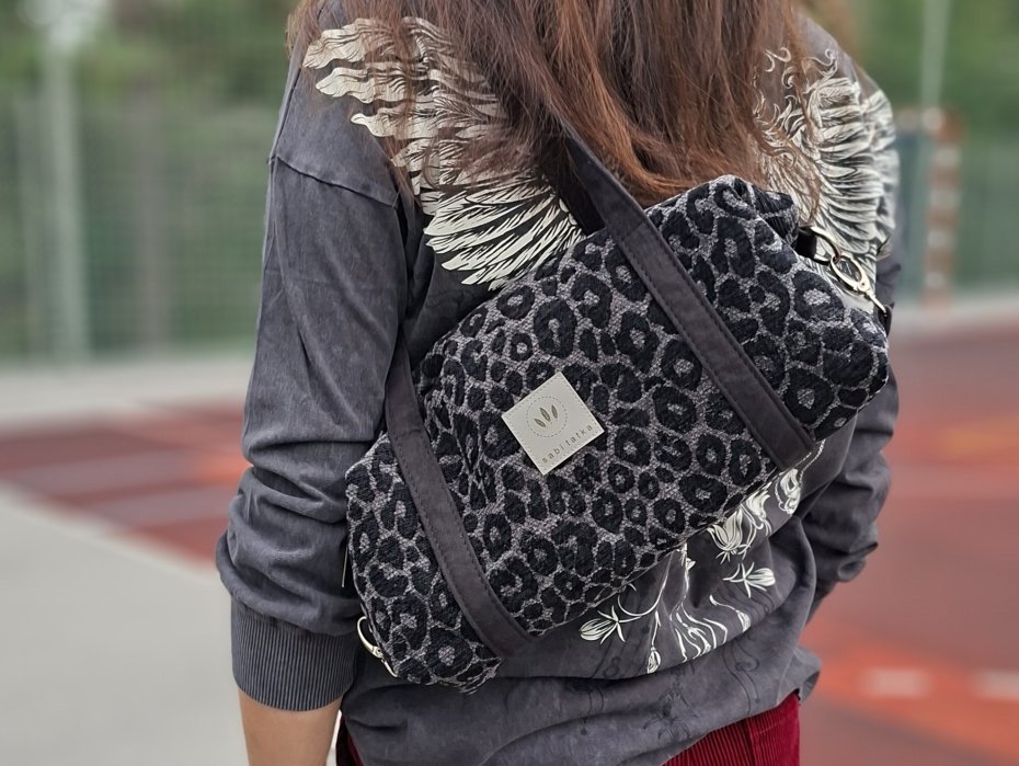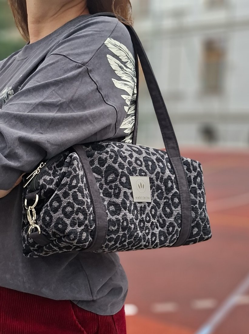 Torebka o podłużnym kształcie z grubej, tkanej żakardowo tkaniny z wzorem panterki.