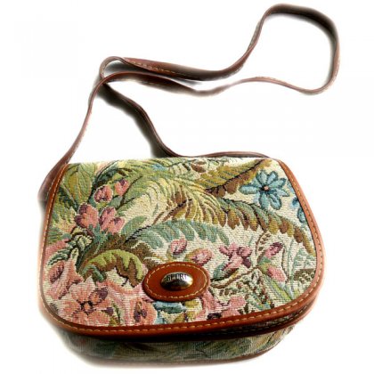 Mała torebka z klapką wykonana z żakardowego materiału na pasku. Z tyłu płatka kieszonka. Wykończona materiałem skóropodobnym (nie ma metki). W środku zapinana na zamek dodatkowa kieszonka. Wymiary: szerokość 20 cm, wysokość 17 cm, głębokość 6,5 cm, dł. paska 100 cm. Idealna do przewieszenia na krzyż.