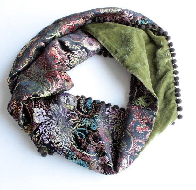 Niezwykły, dwustronny szal. Z jednej strony żakardowa tkanina o złotawym połysku, z drugiej - oliwkowy welur.