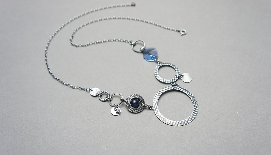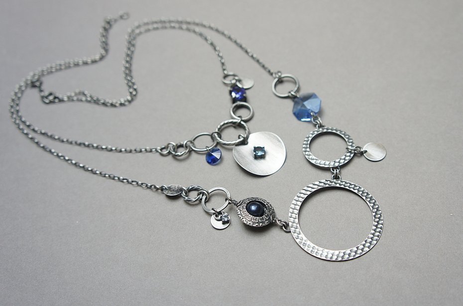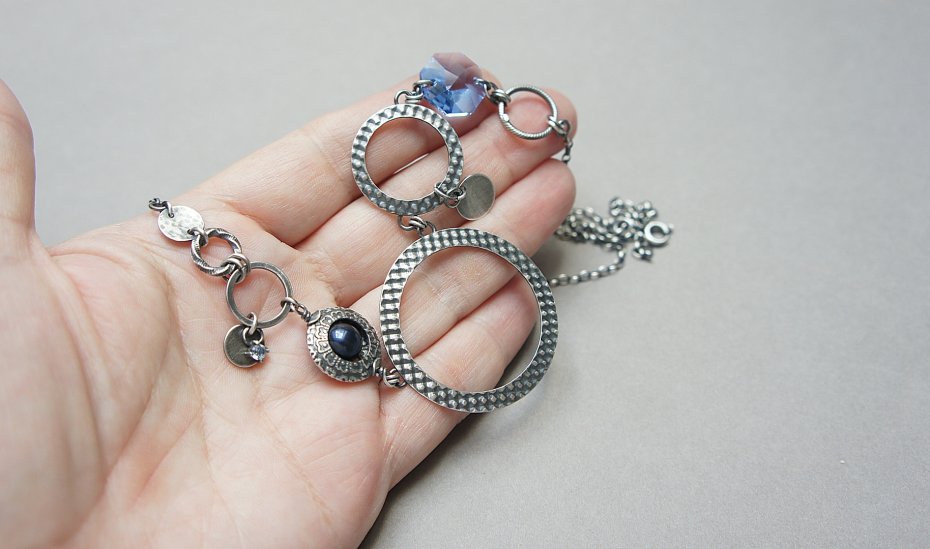 Naszyjnik wykonany ze srebra [pr. 925] w połączeniu z cyrkonią [3mm] ,kryształkiem Swarovski[12mm] ,naturalną perłą w koraliku przestrzennym [8mm] oraz srebrnymi blaszkami i ogniwami [8mm ,10mm,12mm,14mm,22mm,40mm] .Całość oksydowana i przetarta. Całkowita długość naszyjnika 57cm. Biżuteria ozdobnie zapakowana. Naszyjnik skomponowany tak ,by mógł stanowić komplet z drugim naszyjnikiem widocznym na zdjęciach .