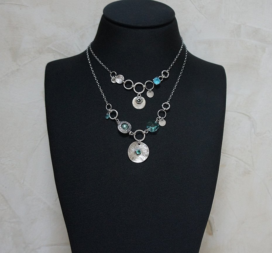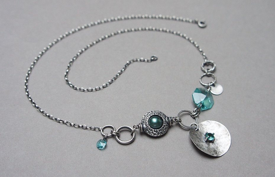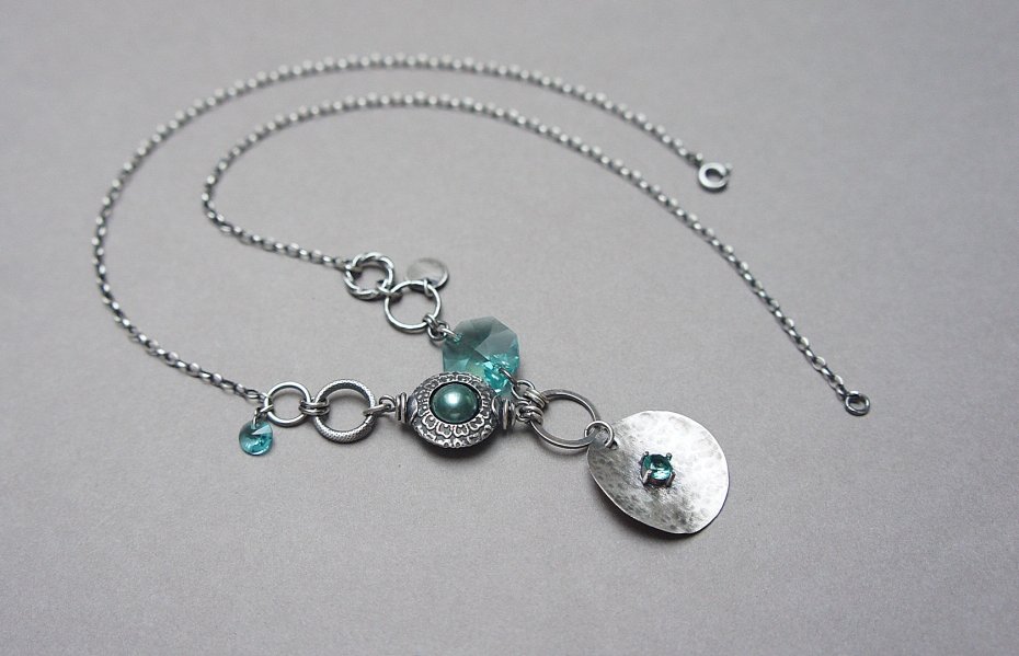 Naszyjnik wykonany ze srebra [pr. 925] w połączeniu z kryształkiem Swarovski [12mm i 6mm], perłą Majorka w koraliku przestrzennym [8mm] ,cyrkonią [4mm] oraz srebrnymi blaszkami i ogniwami [8mm, 10mm,12mm,14mm,24mm]. Całość oksydowana i przetarta. Całkowita długość naszyjnika 53cm. Biżuteria ozdobnie zapakowana. Naszyjnik skomponowany tak, by mógł stanowić komplet z drugim naszyjnikiem widocznym na zdjęciach .
