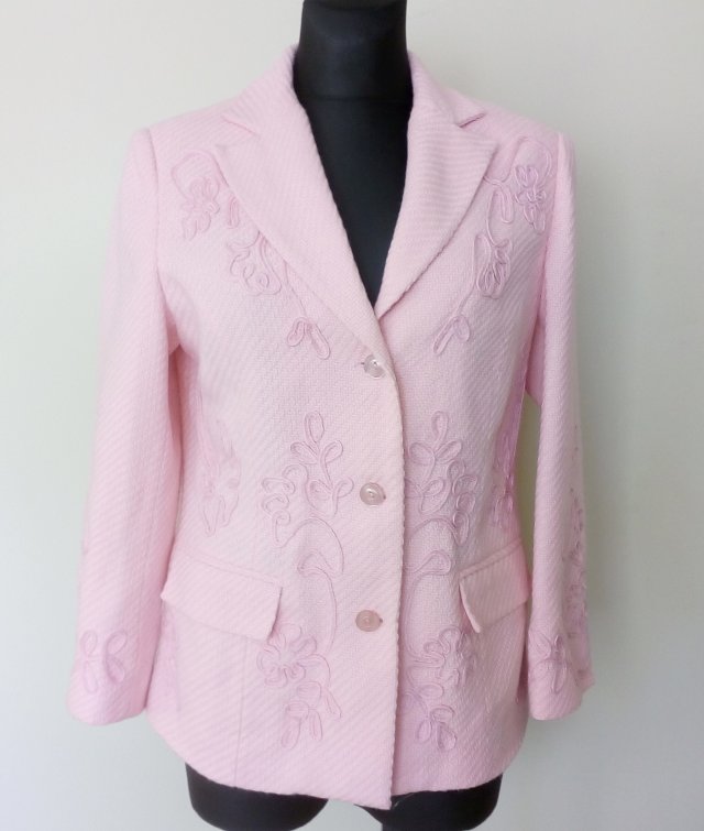 Jasnoróżowy żakiet z wyraźną fakturą tkaniny, przód i rękawy zdobione tasiemkowymi aplikacjami, żakiet zapinany na trzy guziki, z przodu wpuszczane kieszenie z patkami, kołnierz z rewersem, na ramionach poduszki, od środka podszewka w kolorze żakietu