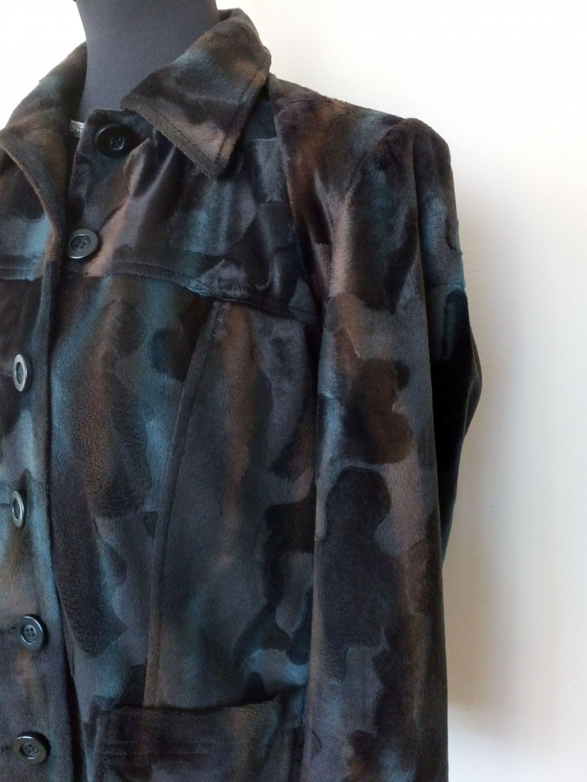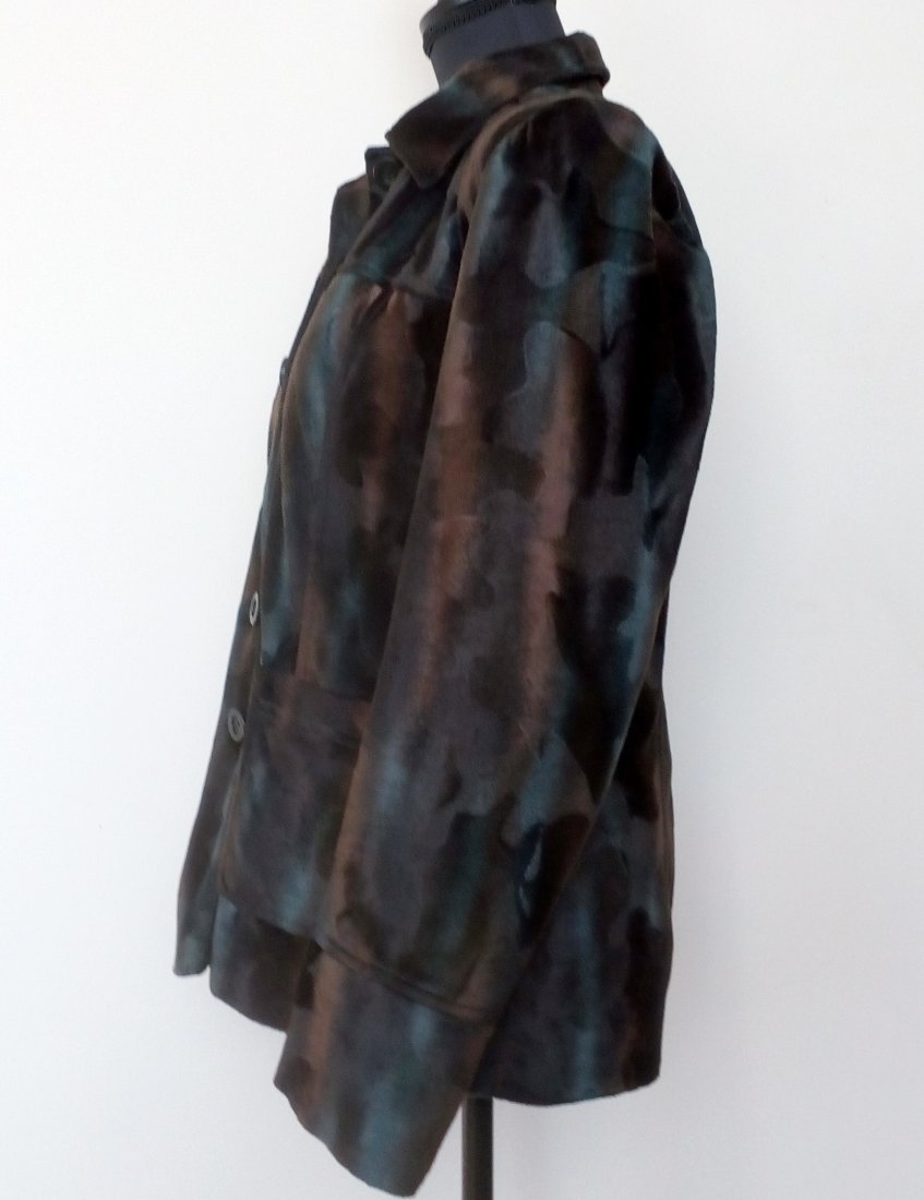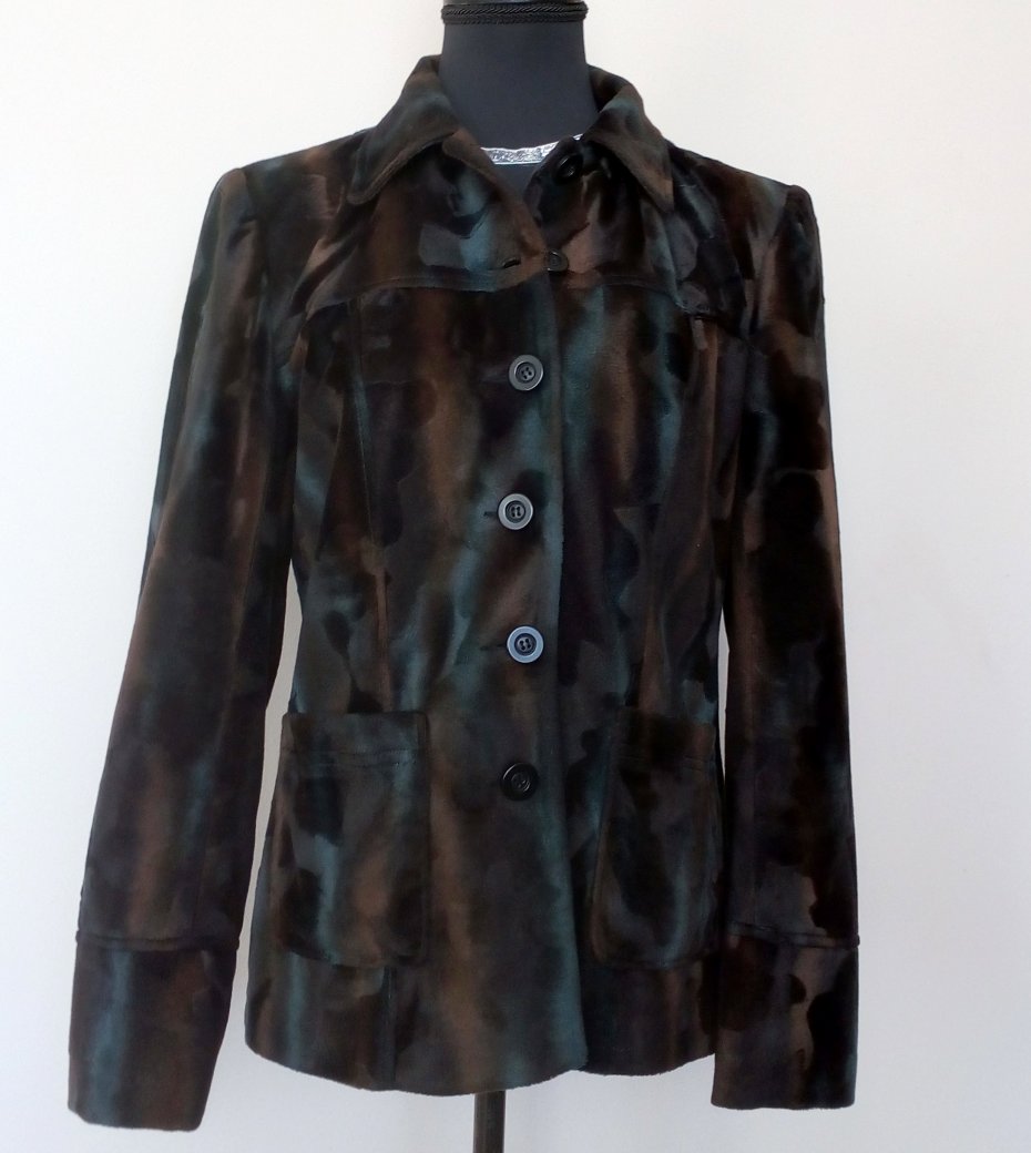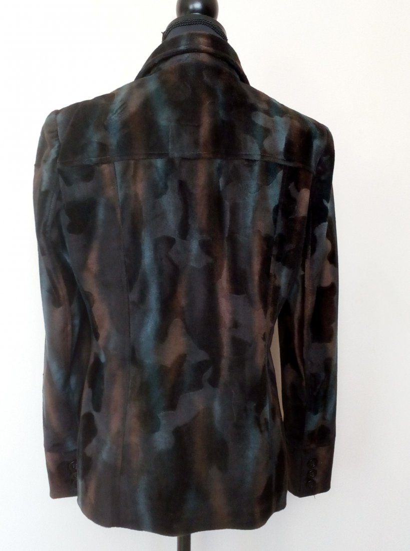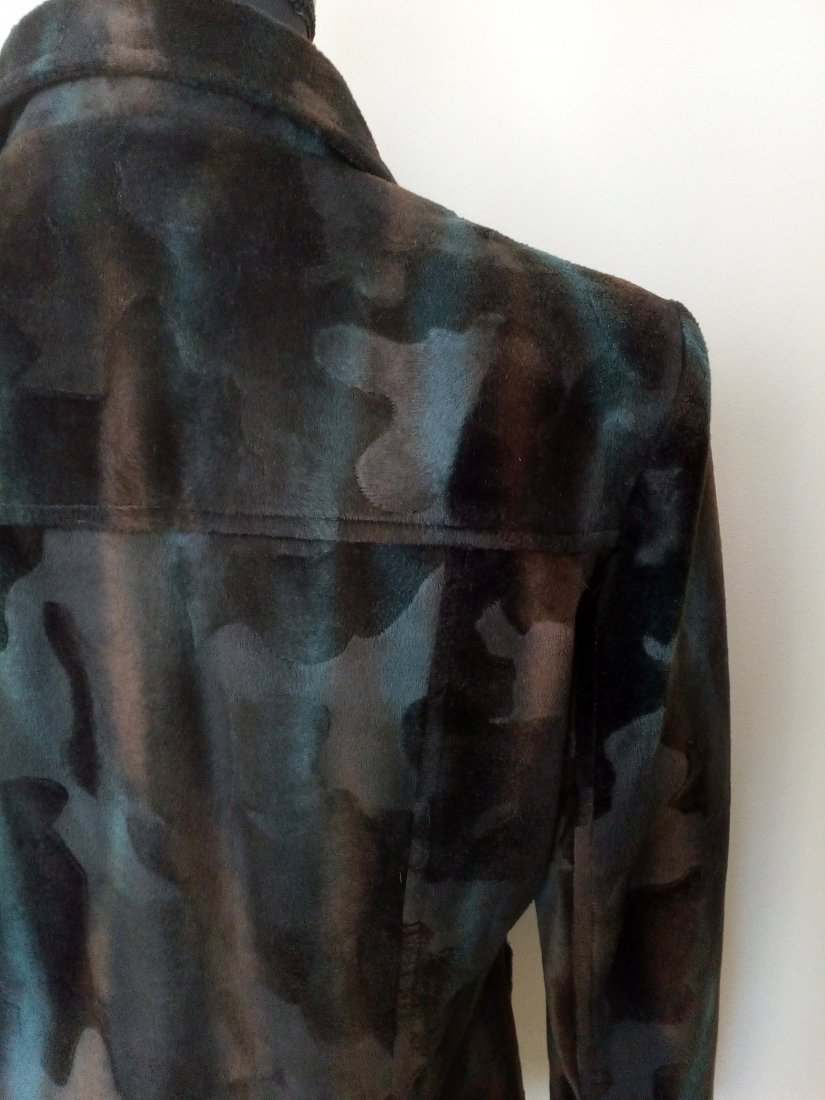 żakiet z materiału imitującego aksamit, w zachodzących na siebie i mieniących się barwach - odcienie czekoladowego brązu i szmaragdu, zapinany wysoko pod szyję, z przodu i z tyłu karczek, od karczku pionowe szwy, z przodu naszywane kieszenie, rękawy z doszywanym wysokim mankietem , na mankiecie trzy guziki ( zapasowe guziki od środka ), od wewnątrz czarna podszewka, na ramionach poduszki