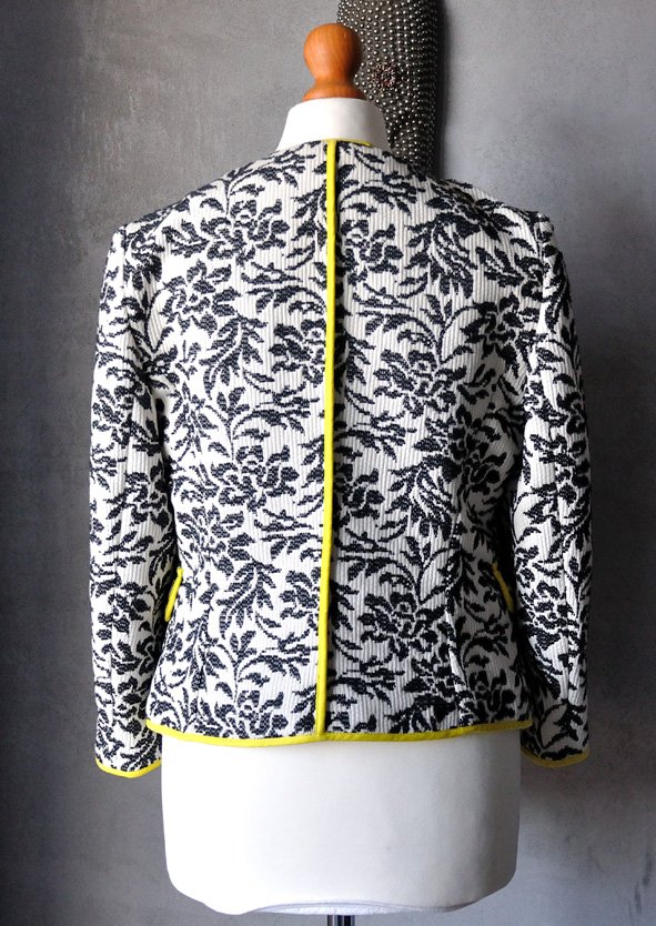 Uszyty z czarno - białego żakardu ozdobionego żółtymi lamówkami: świetny, przykuwający oko i przełamujący klasykę detal. Żółty jest jasny, energetyczny i żywy - niemal neonowy (ale nie jest neonowy!).