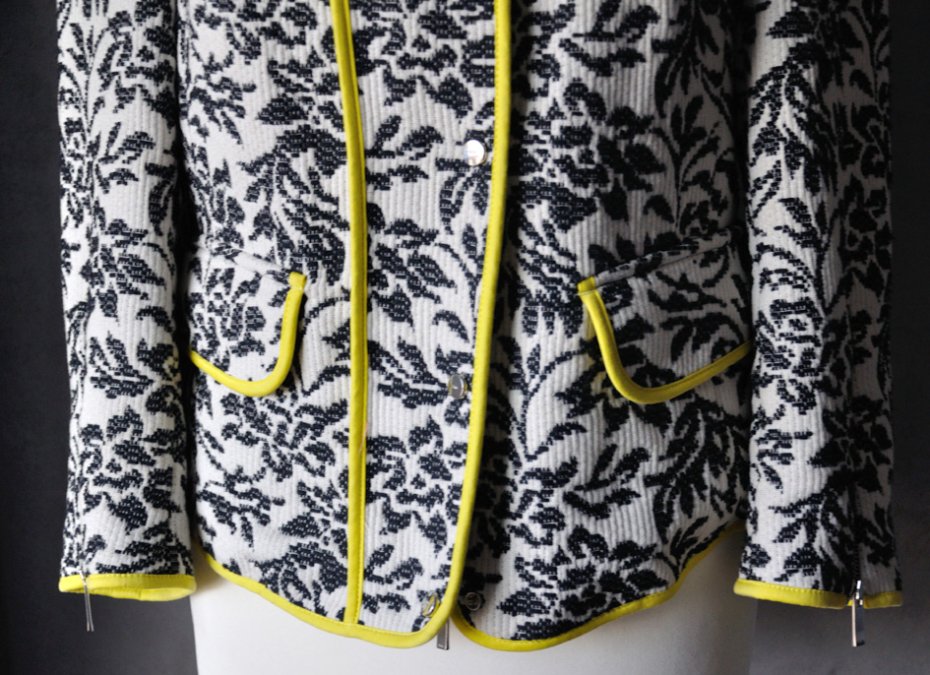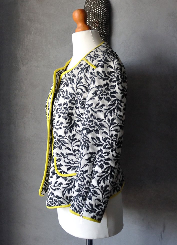 Uszyty z czarno - białego żakardu ozdobionego żółtymi lamówkami: świetny, przykuwający oko i przełamujący klasykę detal. Żółty jest jasny, energetyczny i żywy - niemal neonowy (ale nie jest neonowy!).