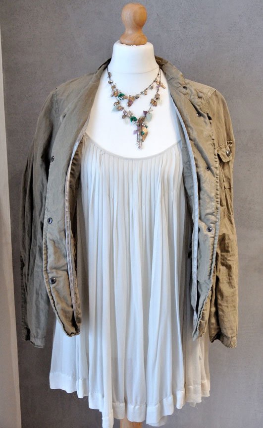 Ni to bluza, ni to żakiet, ni to kurtka. Wojskowa khaki zieleń ze złocistym, metalicznym połyskiem. To mienienie się jest bardzo dyskretne, widać je tylko, kiedy światło pada wprost na tkaninę. Piękny efekt.