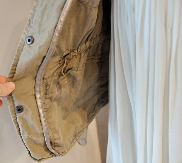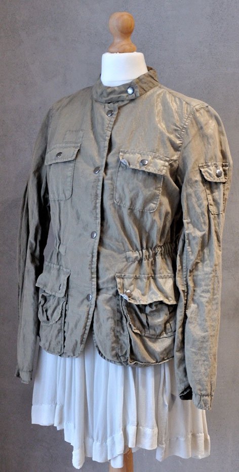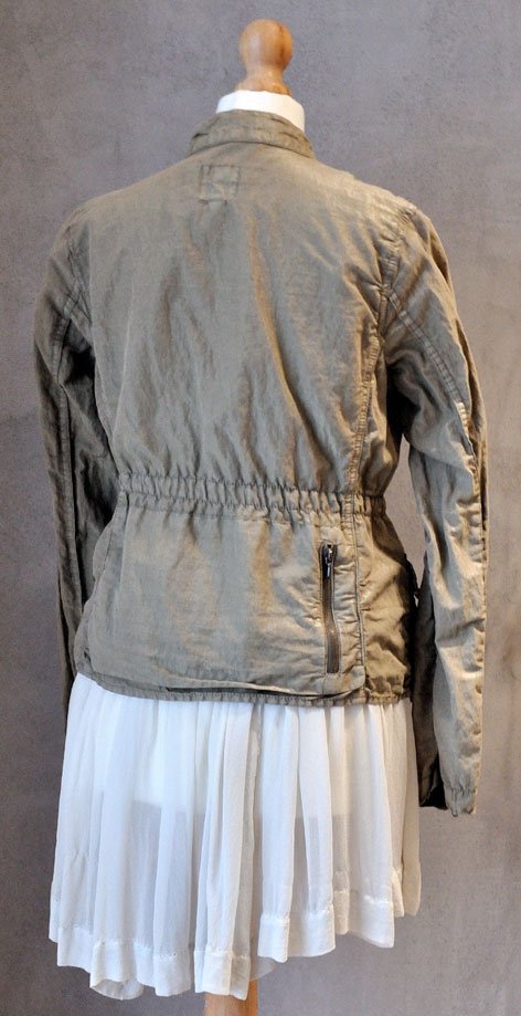 Ni to bluza, ni to żakiet, ni to kurtka. Wojskowa khaki zieleń ze złocistym, metalicznym połyskiem. To mienienie się jest bardzo dyskretne, widać je tylko, kiedy światło pada wprost na tkaninę. Piękny efekt.