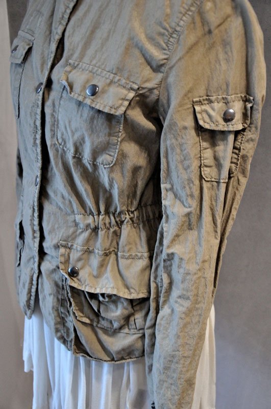 Ni to bluza, ni to żakiet, ni to kurtka. Wojskowa khaki zieleń ze złocistym, metalicznym połyskiem. To mienienie się jest bardzo dyskretne, widać je tylko, kiedy światło pada wprost na tkaninę. Piękny efekt.