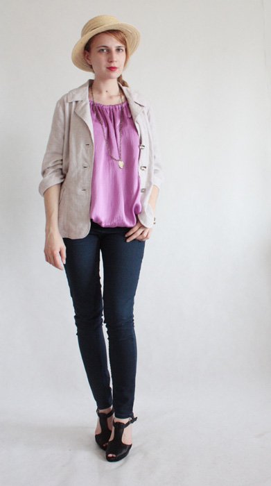 Beżowy żakiet zapinany na niezwykle oryginalne guziki w kolorze srebnrym.