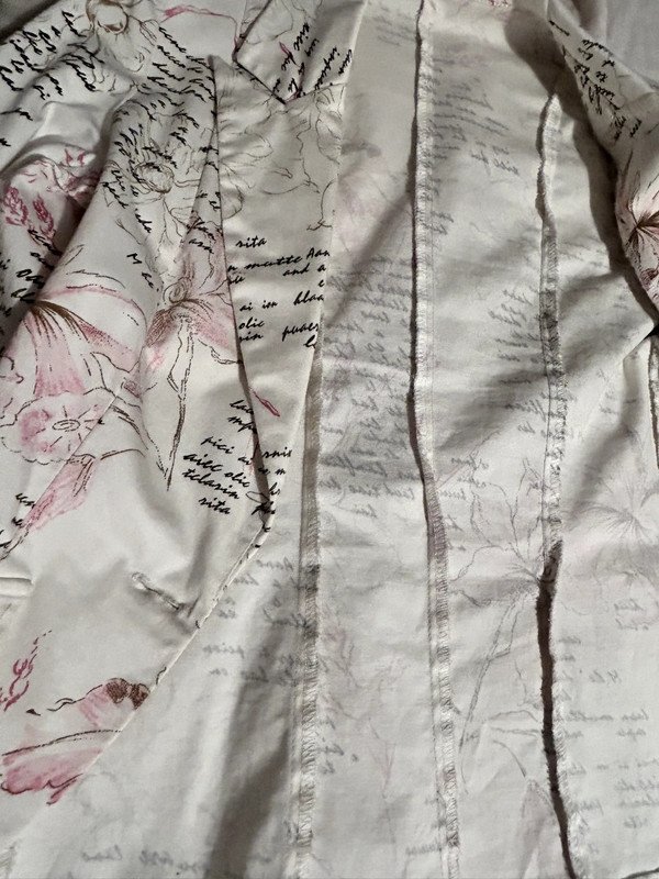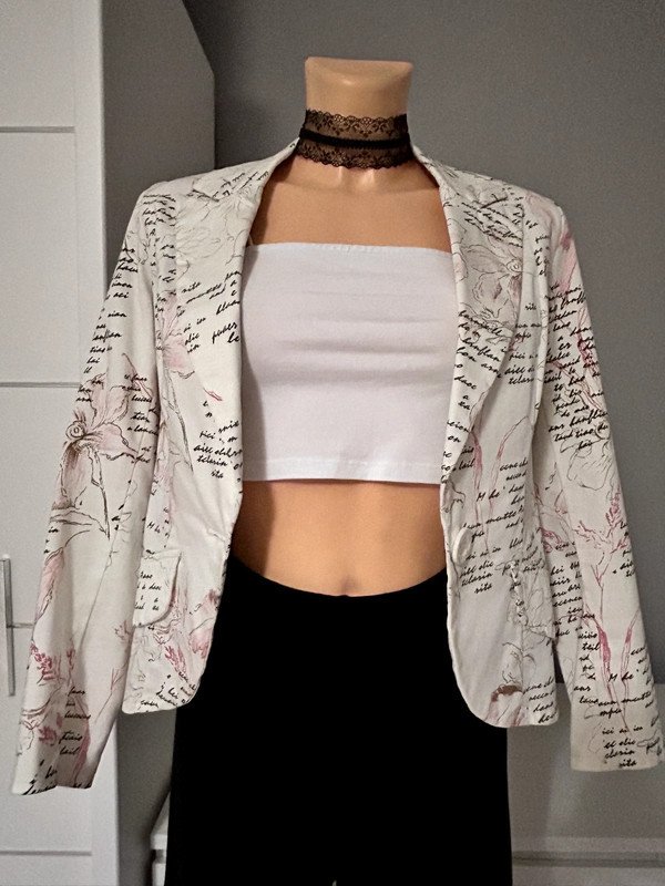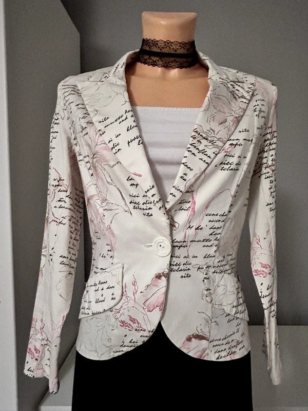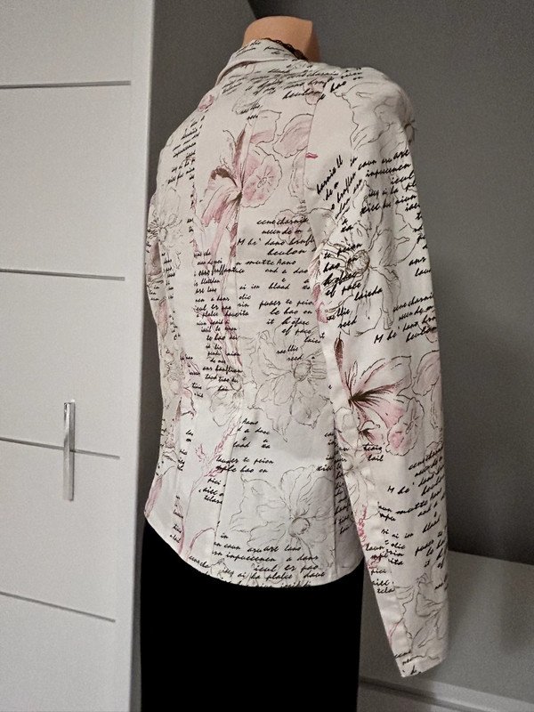 Kobieca marynarka, żakiet w kwiatowy wzór, print, rozmiar 36. Elastyczna wykonana w całości z bawełny. Kolor ecru w kwiatowy różowy wzór, print z czarnymi napisami.