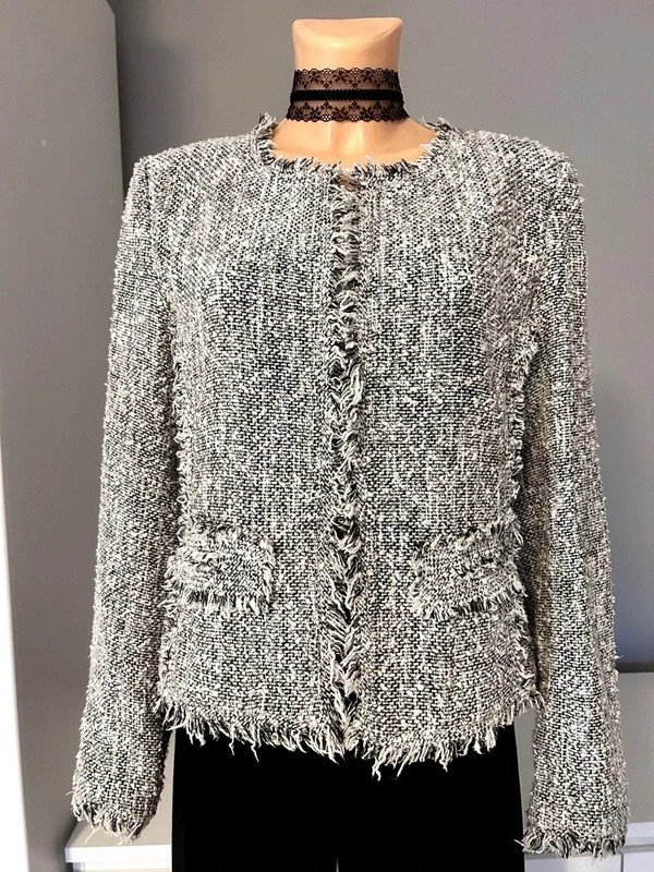 Piękny żakiet tweedowy firmy premium Second Female. Czarno-kremowy melanż, grubo tkany material, bardzo miły w dotyku, modne strzępienia. Pięknie wykończony lamówkami, bez podszewki przez co bardzo wygodny. Klasyczny I elegancki. Old money style, szafa kapsułowa. Idealny do biura I na imprezy.