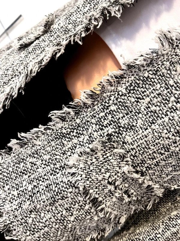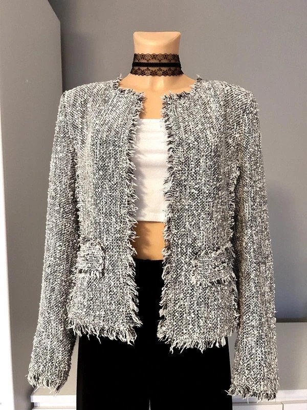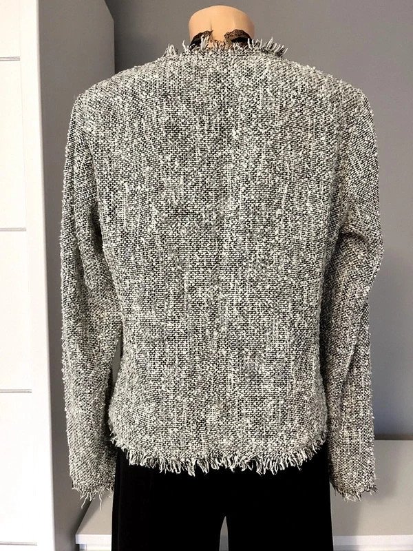 Piękny żakiet tweedowy firmy premium Second Female. Czarno-kremowy melanż, grubo tkany material, bardzo miły w dotyku, modne strzępienia. Pięknie wykończony lamówkami, bez podszewki przez co bardzo wygodny. Klasyczny I elegancki. Old money style, szafa kapsułowa. Idealny do biura I na imprezy.