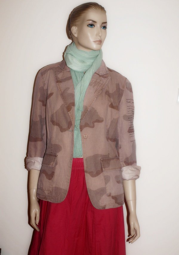 Bardzo oryginalny żakiet/kurtka we wzór moro, w kolorach beżu jakby z domieszką różowego. Marka Nice TM. Z tyłu wstawka ze ściągacza, na rękawie i plecach nadruki. Rękaw z pęknięciem na dole. Zapinana na 1 guzik. Materiał 100% bawełna, podszewka z siateczki. Stan bardzo dobry-, (mała skaza fabryczna na dole rękawa w postaci niedobarwionej kropki). Rozmiar z metki XL, powinien być dobry na osobę o rozmiarze 42. Podaję wymiary mierzone na płasko;