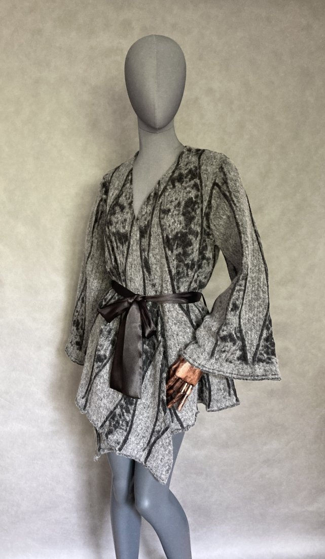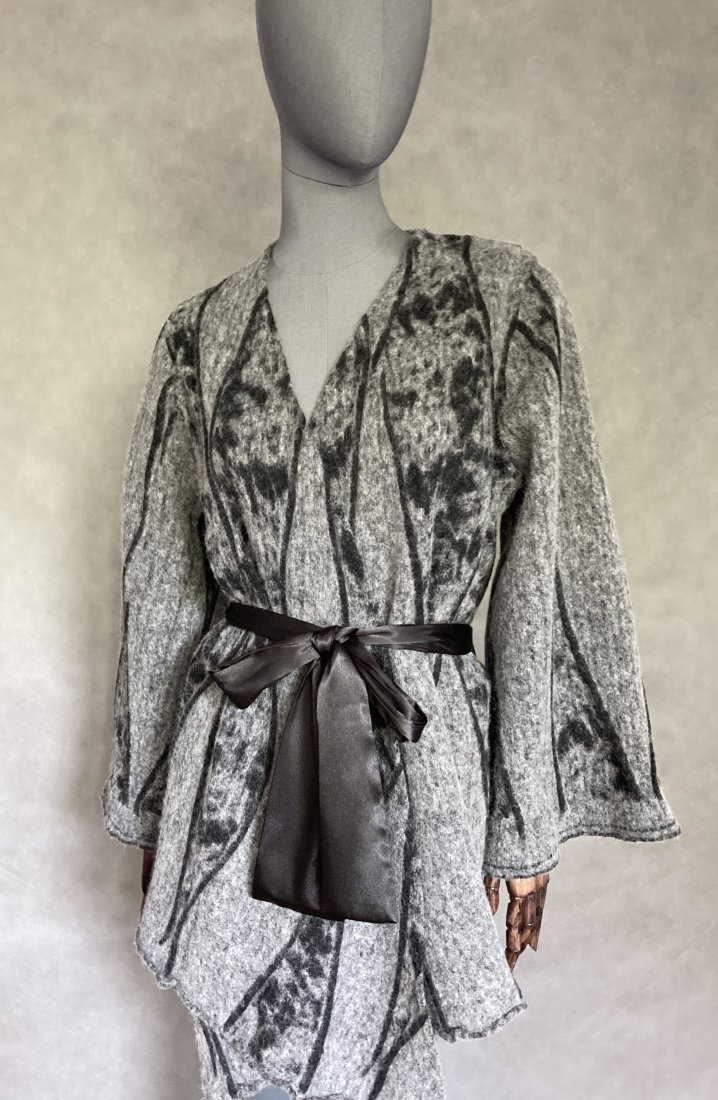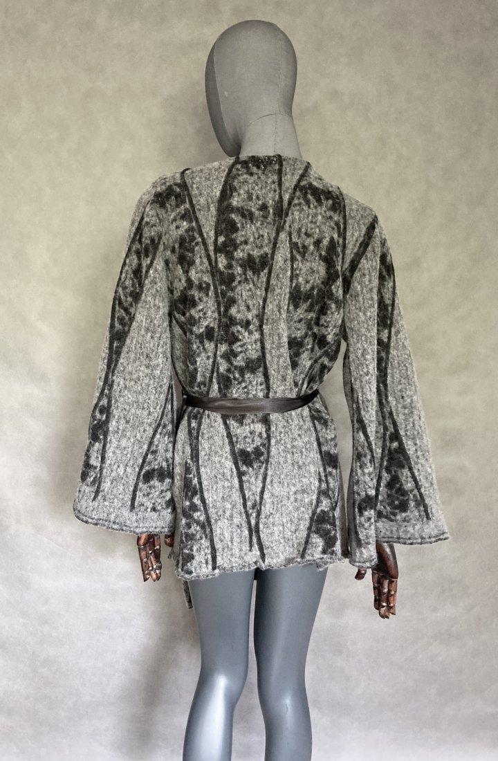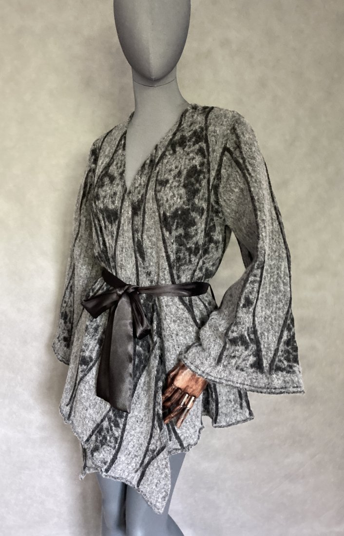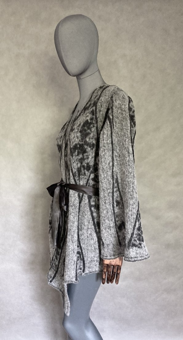 Żakiet sweter uszyłam z dwóch wełny w ciekawy miejscami transparenty wzór w kolorach szarości i czerni. Asymetryczny fason z przodu i dekolt w szpic, rękawy rozkloszowane, wiązany w pasie jedwabną szarfą. Sweter bez podszewki