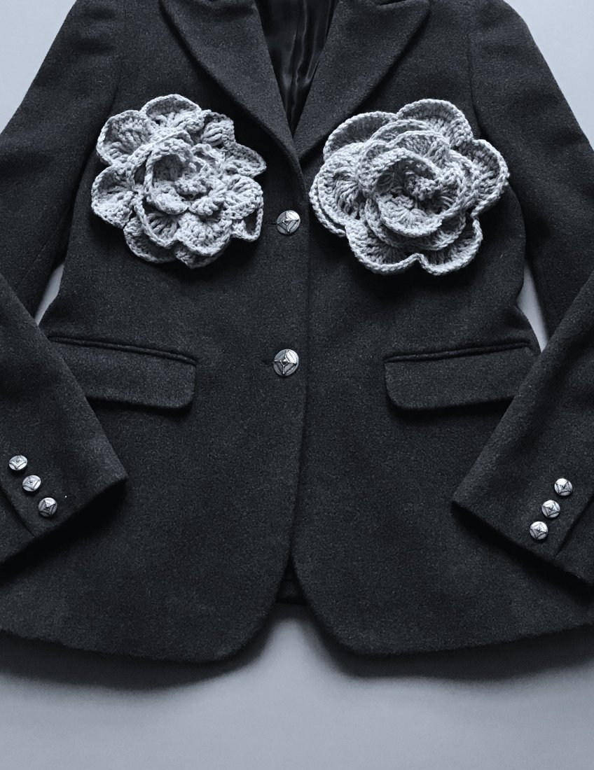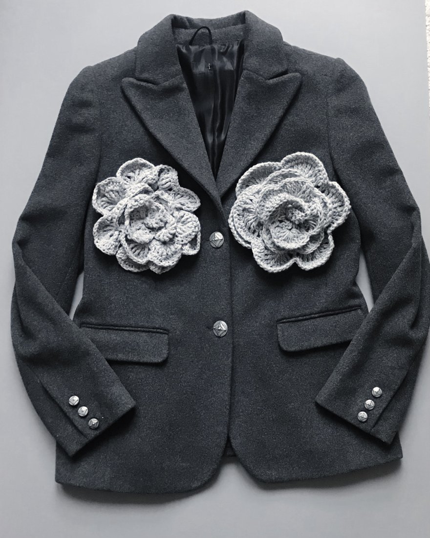 Polecam przepiękny z grubej i miękkiej wełny, dzięki czemu możemy w cieplejsze dni nosić jako okrycie wierzchnie. Żakiet , ozdobiony szydełkowymi kwiatami. Broszki zapinane na agrafki, dziki czemu możemy modyfikować miejsce zapięcia. Zapinany ozdobnymi, metalowymi guzikami na wiskozowej podszewce. Z przodu dwie kieszenie z klapkami. Delikatnie taliowany z wyprofilowanym biustem i zaszewkami. Jedyny i niepowtarzalny wzór. Brak metek, stan idealny jak nowy. wełna