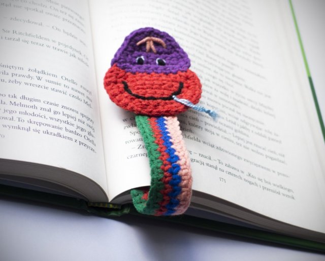 Urocza zakładka do książki- wąż, zrobiony na szydełku.