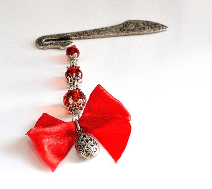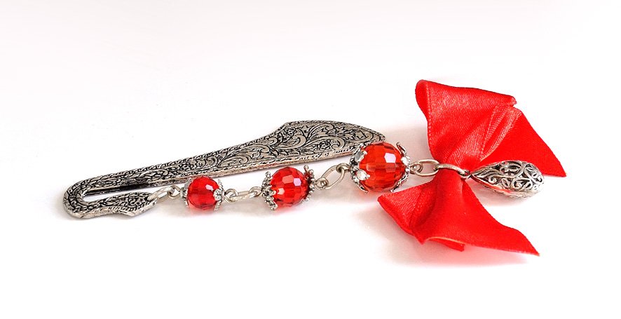 Ozdobna zakładka Bali z metalu w kolorze srebrnym z pokryta bogatym ornamentem oraz duża zawieszka składająca się z okrągłych, czerwonych kryształów swarovski ozdobionych przekładkami bali. Na końcu wisi ażurowa kropla ozdobiona czerwoną, satynową kokardą.