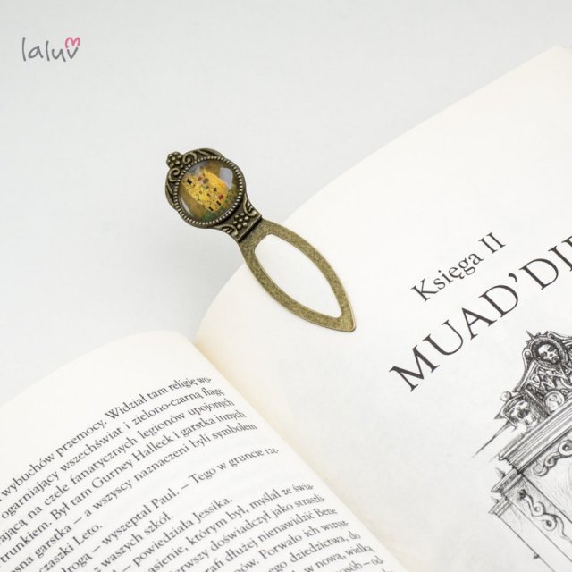 Ręcznie robiona zakładka do książki z wysokiej jakości grafiką zamkniętą pod wypukłym szkiełkiem i oprawioną w bazę w kolorze antycznego złota.