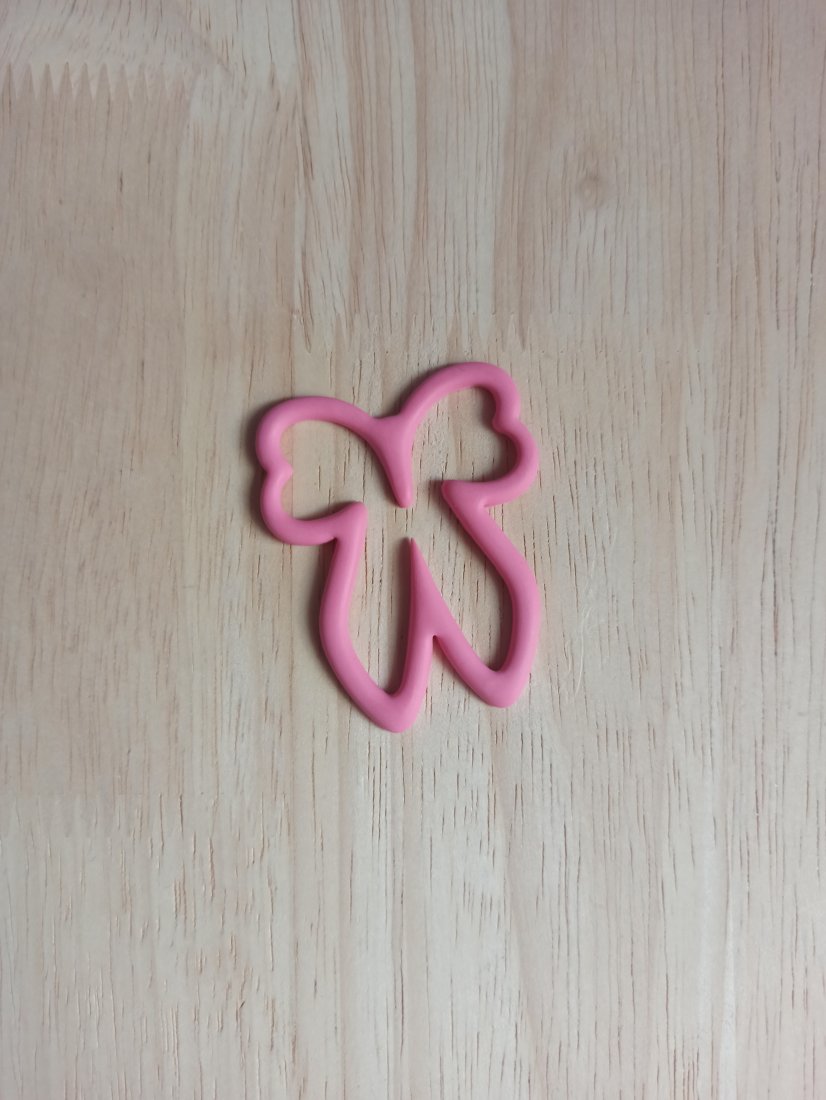 Zakładka do książki w kształcie kokardki wykonana z wysokiej jakości gliny polimerowej w kolorze różowym.