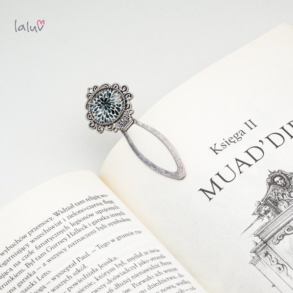 Ręcznie robiona zakładka do książki z wysokiej jakości grafiką zamkniętą pod wypukłym szkiełkiem i oprawioną w bazę w kolorze srebrnym.