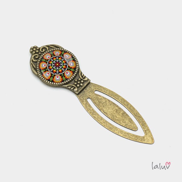 Ręcznie robiona zakładka do książki z wysokiej jakości grafiką zamkniętą pod wypukłym szkiełkiem i oprawioną w bazę w kolorze antycznego złota.