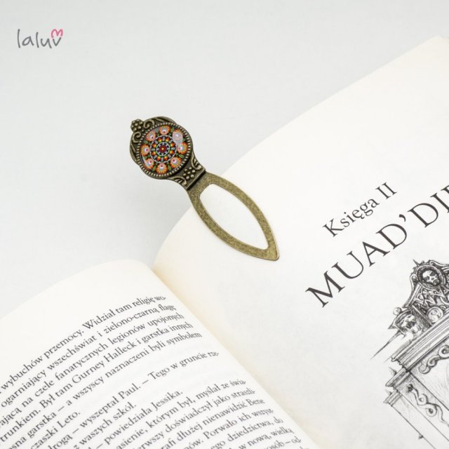 Ręcznie robiona zakładka do książki z wysokiej jakości grafiką zamkniętą pod wypukłym szkiełkiem i oprawioną w bazę w kolorze antycznego złota.